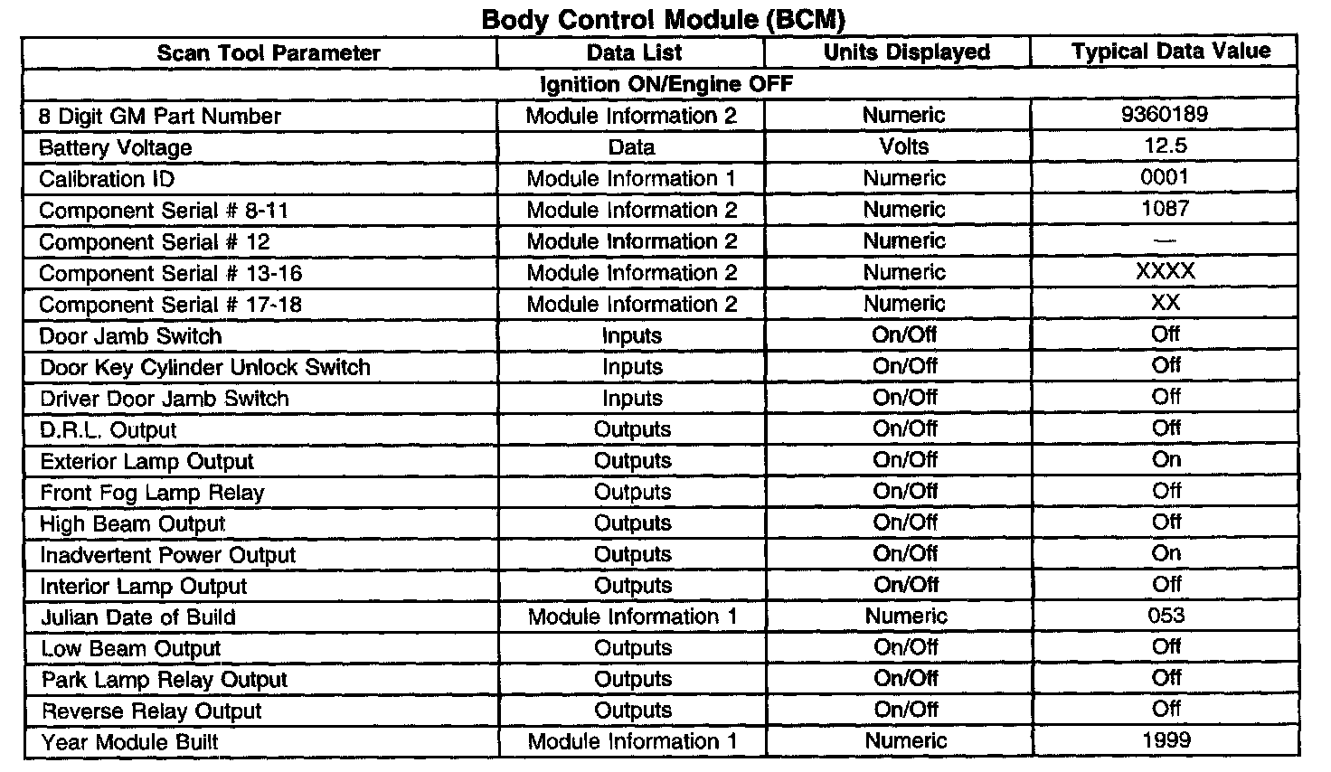 Scan Tool Data List - Body Control Module (BCM)