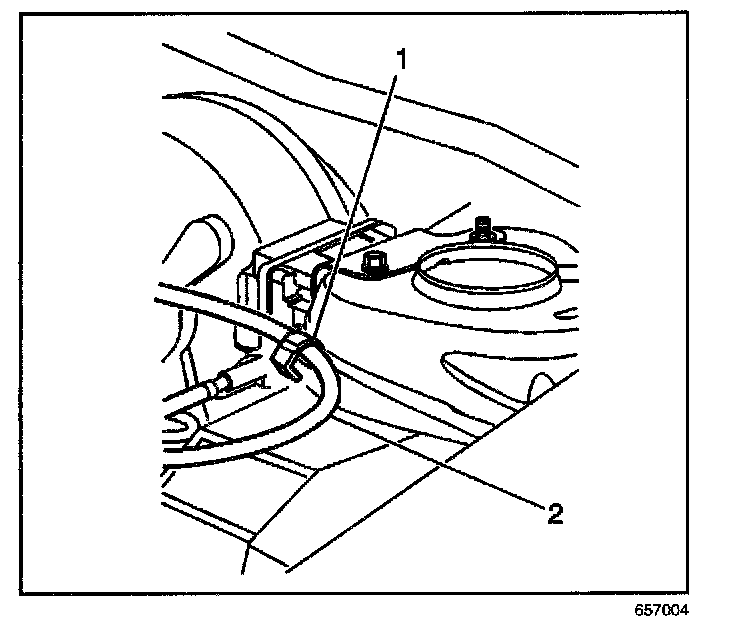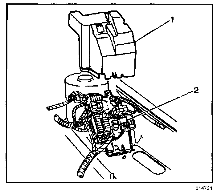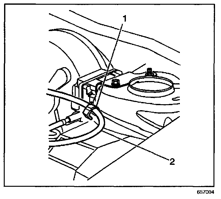 14. Secure the cruise control cable (2) to the retention clip (1) located on the left strut tower.