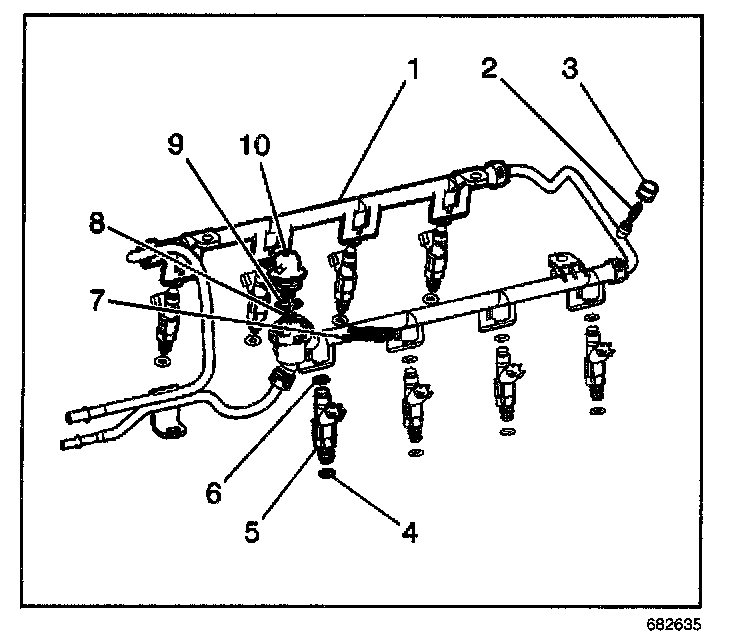 The fuel rail assembly (1) attaches to the engine intake manifold. The fuel rail assembly performs the following functions:
