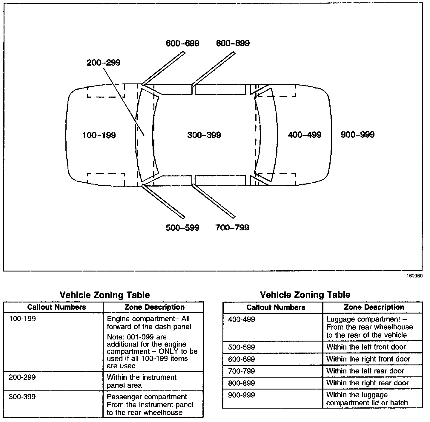 All grounds, in-line connectors, pass-through grommets, and splices have identifying numbers that correspond to where they are located in the vehicle. The table explains the numbering system.
