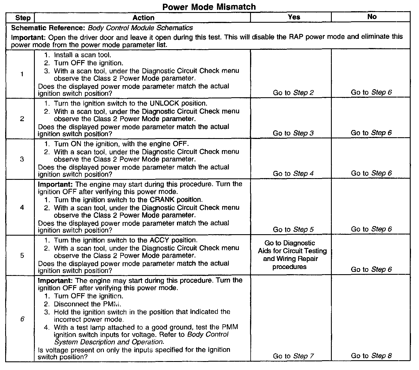 CIRCUIT DESCRIPTIONNormal vehicle class 2 communications and module operations will not begin until the system power mode has been identified. Discrete wires from the ignition switch contacts are monitored by the power mode master (PMM) module in order to determine the correct power mode. The PMM communicates the system power mode to all class 2 modules on the class 2 serial data line. Refer to Body Control System Description and Operation to identify which module is the PMM and the applicable power mode look up table.