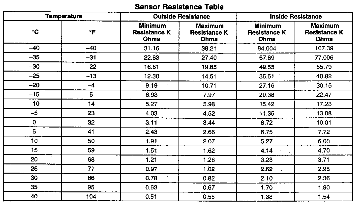 Sensor Resistance Table: