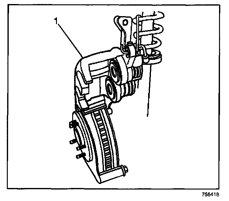 Notice: Support the brake caliper with heavy mechanic's wire, or equivalent, whenever it is separated from it's mount and the hydraulic flexible brake hose is still connected. Failure to support the caliper in this manner will cause the flexible brake hose to bear the weight of the caliper, which may cause damage to the brake hose and in turn may cause a brake fluid leak.