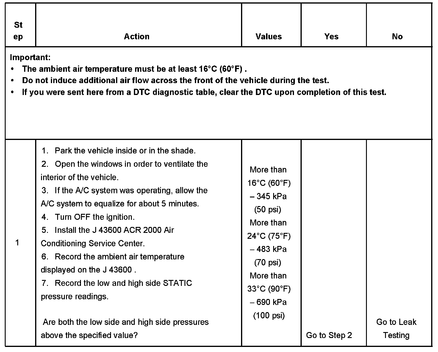 1. This step determines if the A/C system has at least the minimum refrigerant charge required to operate the system without damage.