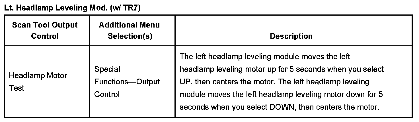 Lt. Headlamp Leveling Mod. (With RPO Code TR7) Scan Tool Output Control: