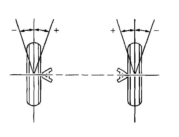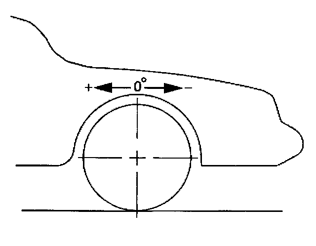 Camber is the tilting of the wheels from the vertical when viewed from the front of the vehicle. When the wheels tilt outward at the top, the camber is positive (+). When the wheel tilts inward at the top, the camber is negative (-). The amount of tilt is measured in degrees from the vertical. Camber settings influence the directional control and the tire wear.