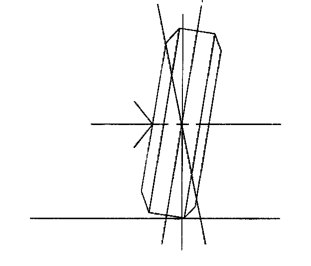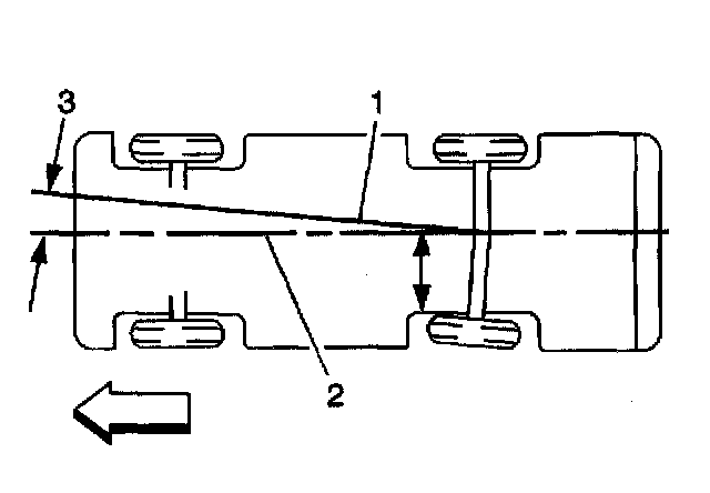 In the illustration, toe-in is shown on the left rear wheel, moving the thrust line (1) off center. The resulting deviation from the centerline is the thrust angle.