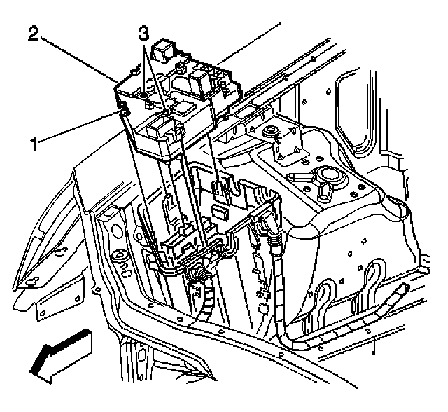 9. Remove the fasteners (1, 2) securing the electrical center (3) to vehicle.