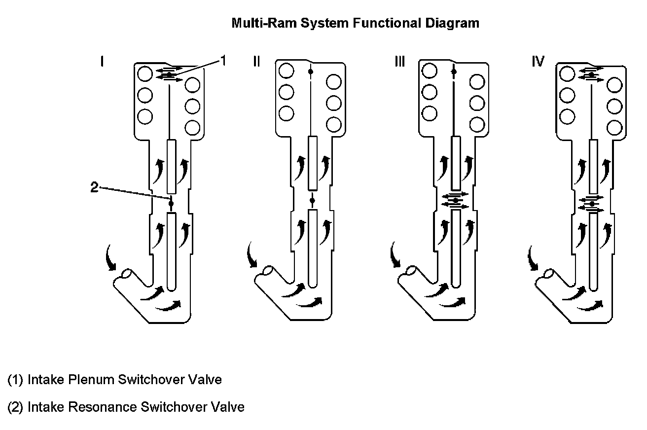 During Wide-open Throttle (WOT) acceleration from low RPM, the control module disables the intake plenum switchover valve. This separates the cylinder banks from each other and connects each of them to its own resonating pipe. With the intake resonance switchover valve now closed, the full length of the resonating pipes is utilized.