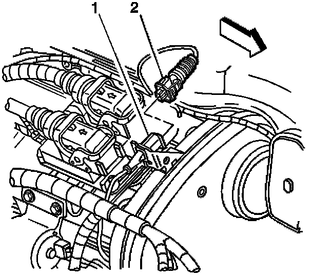 REMOVAL PROCEDURE1. Disconnect the knock sensor pigtail (1) from the electrical connector (2) and bracket.