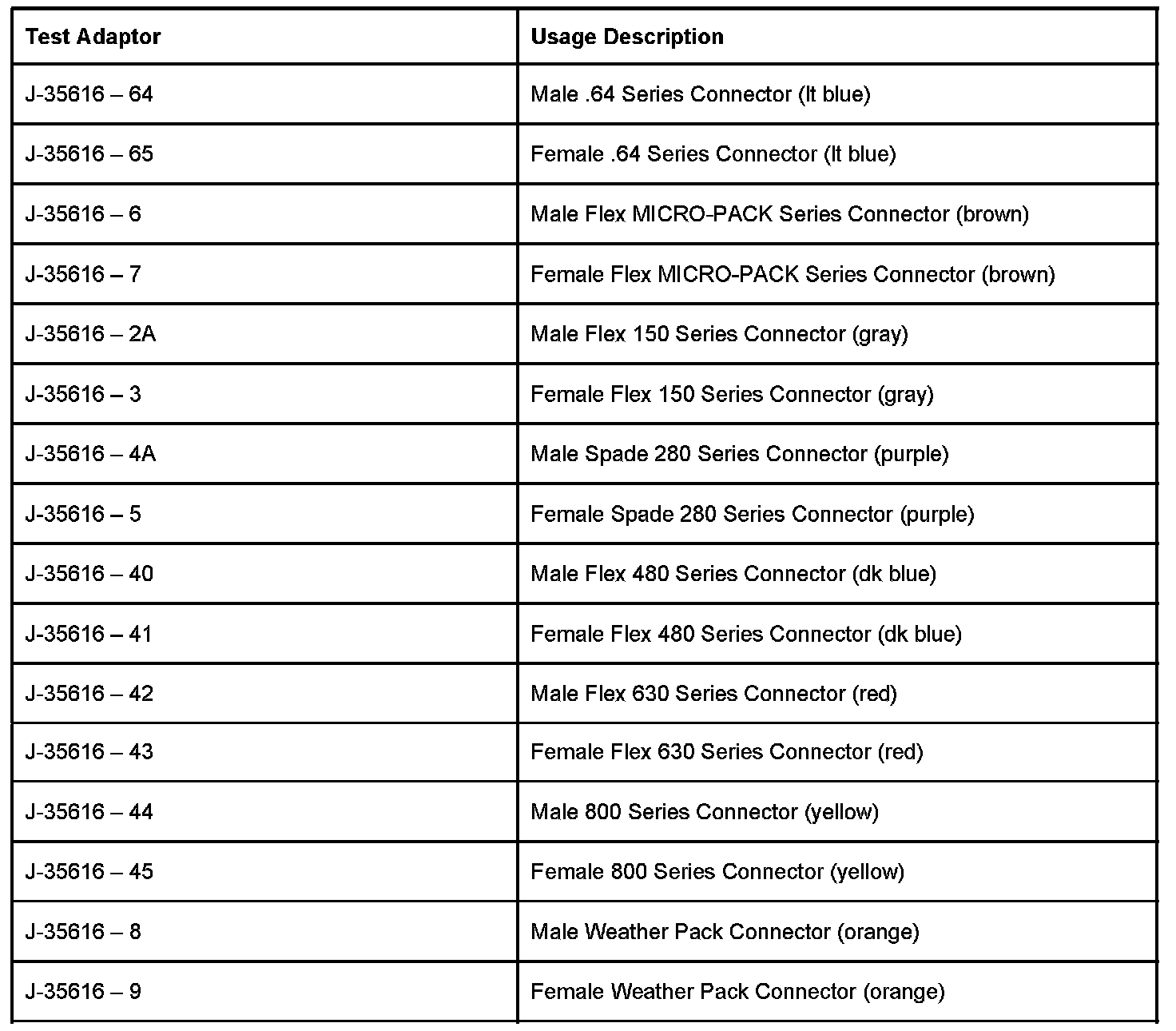 Refer to the table as a guide in selecting the correct test adapter for frontprobing connectors: