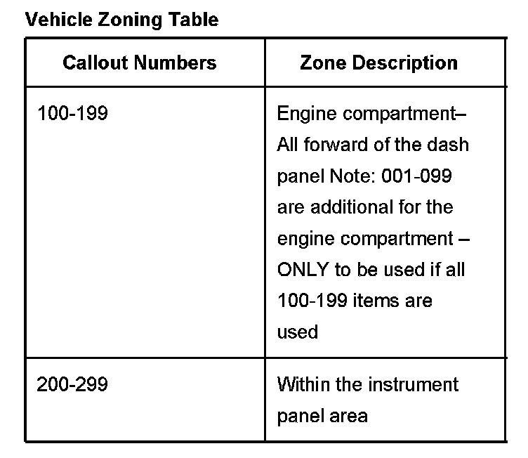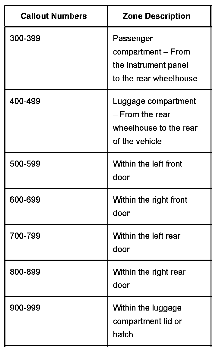 All grounds, in-line connectors, pass-through grommets, and splices have identifying numbers that correspond to where they are located in the vehicle. The table explains the numbering system.