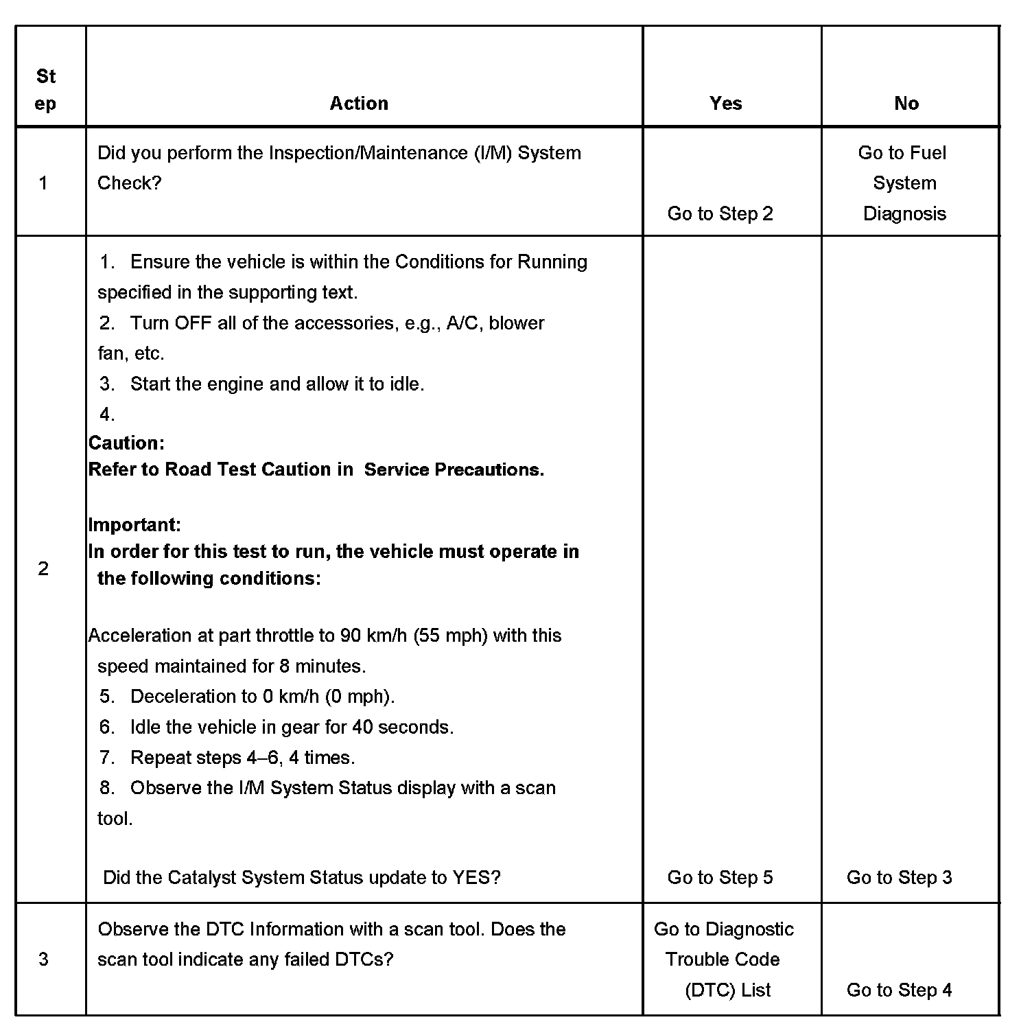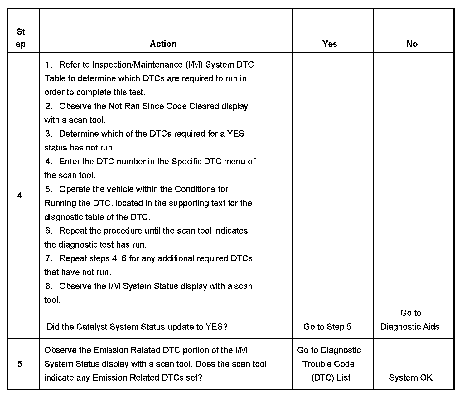 3. This step is to identify a first failure of a type B DTC. A DTC only appears on the I/M System Status display when it becomes a MIL illuminating DTC. This occurs on the second failure of a type B DTC. A first failure of a type B DTC will not allow the I/M System Status to update to YES. Refer to Diagnostic Aids.