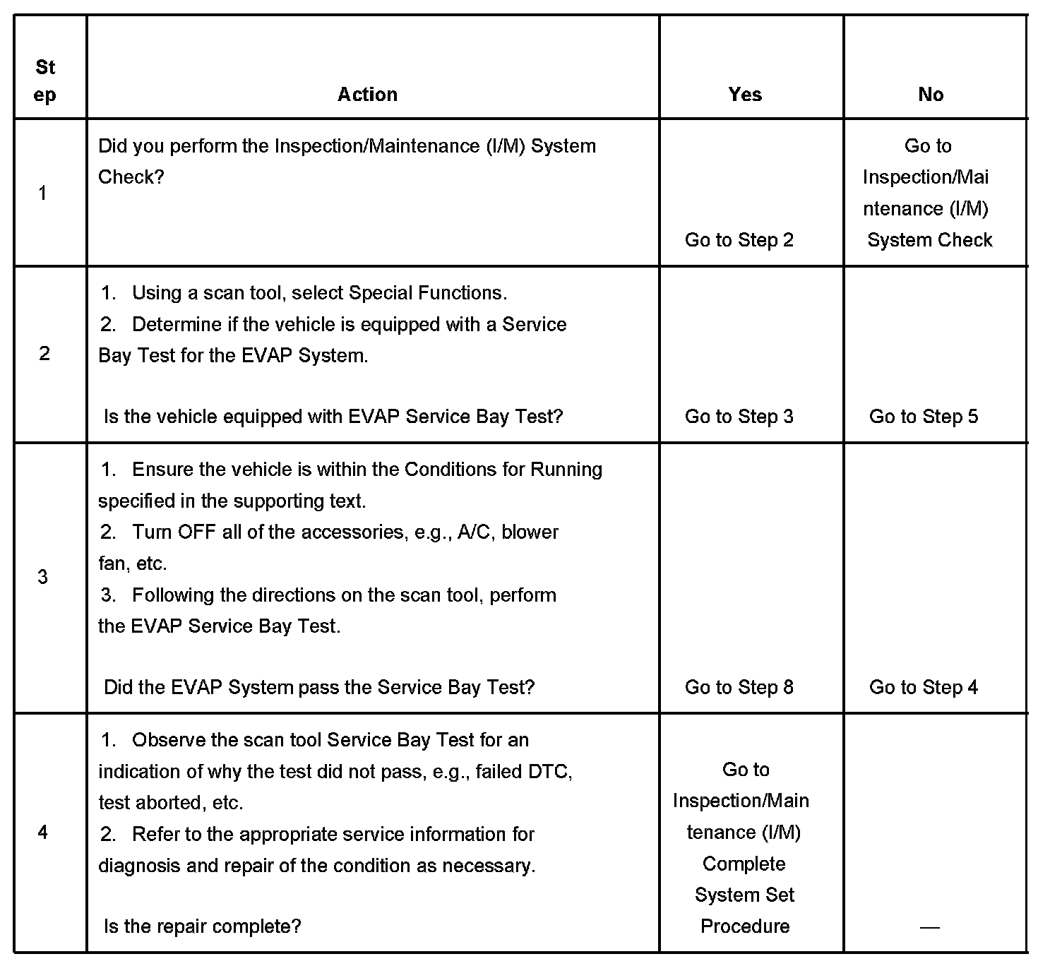 3. This step is to determine whether or not the EVAP system test has passed. If the system is operating correctly, the scan tool indicates that the system has passed and the I/M System Status updates to YES. If the EVAP Service Bay Test aborts because of lost enable conditions, the test can be repeated once the enable criteria is met.