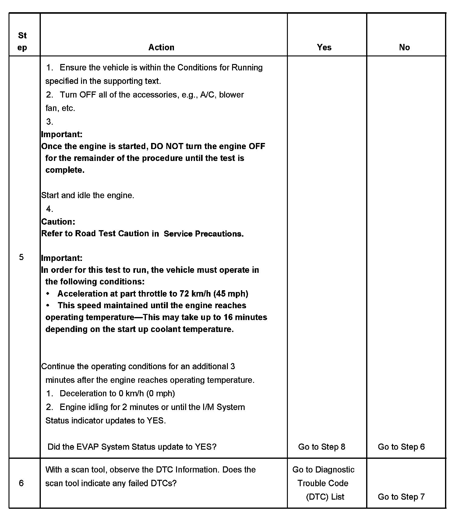 6. This step is to identify a first failure of a type B DTC. A DTC only appears on the I/M System Status display when it becomes a MIL illuminating DTC. This occurs on the second failure of a type B DTC. A first failure of a type B DTC will not allow the I/M System Status to update to YES. Refer to Diagnostic Aids.
