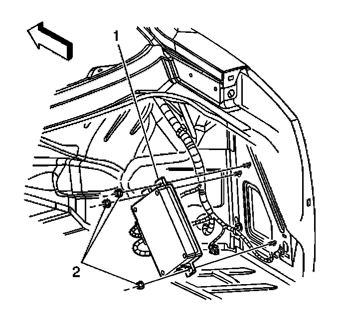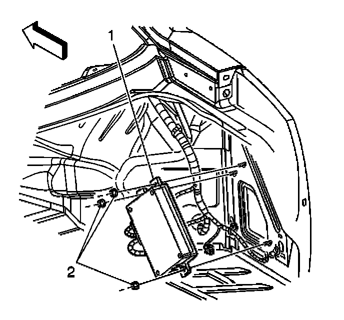 2. Remove the nuts (2) securing the OnStar(r) module (1) to the vehicle body.