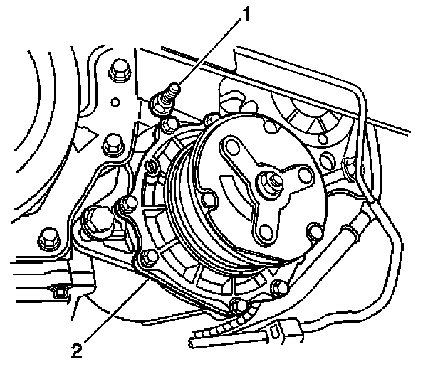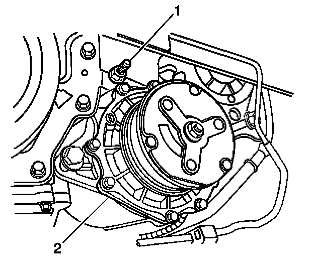 3. Tighten the front A/C compressor mounting bolt (2) to 50 N.m (37 lb ft).