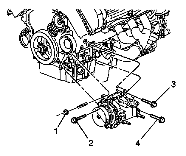 12. Remove the A/C compressor mounting fasteners (1, 2, 3, 4).