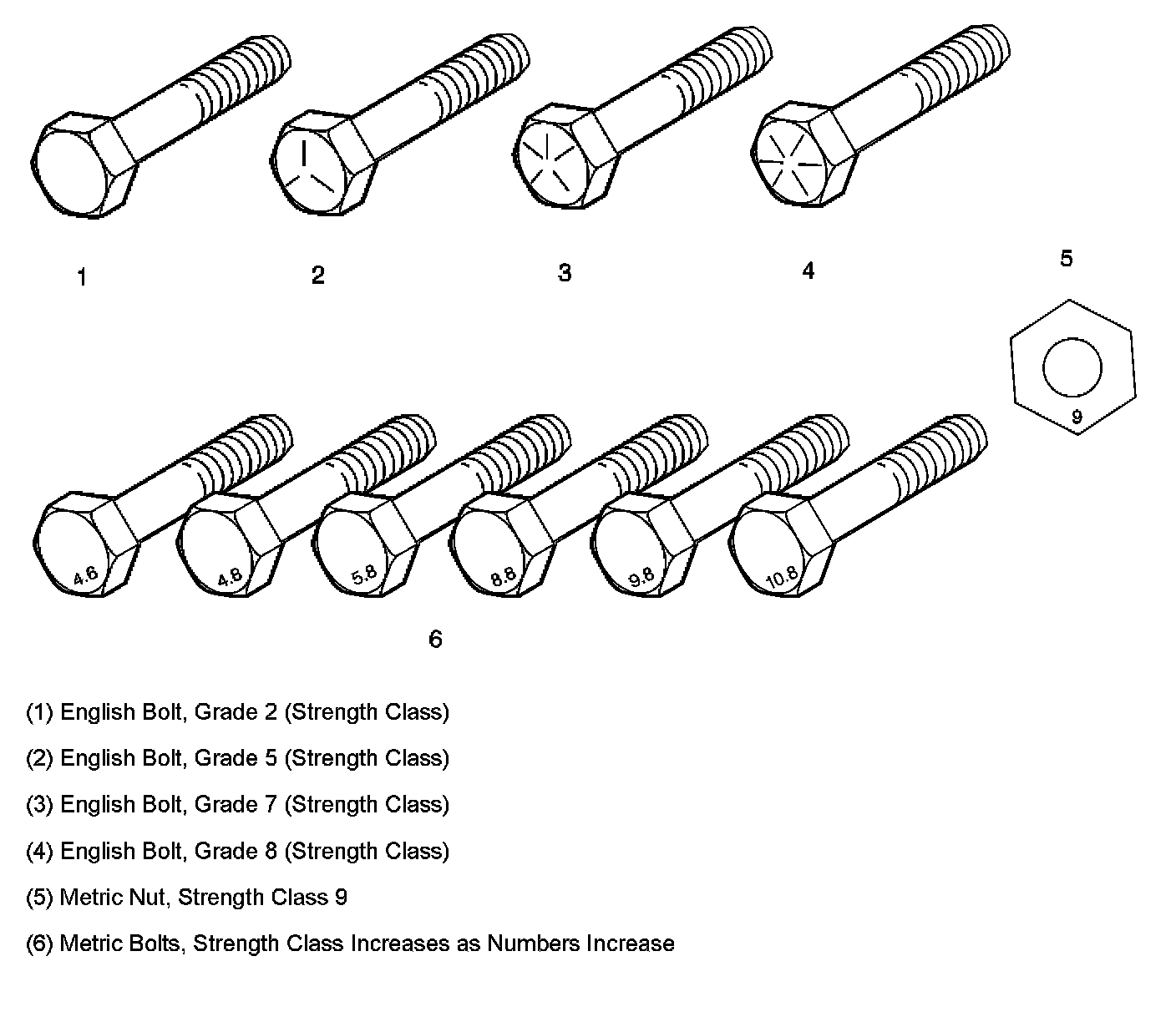 The most commonly used metric fastener strength property classes are 9.8 and 10.9. The class identification is embossed on the head of each bolt. The English, inch strength classes range from grade 2 to grade 8. Radial lines are embossed on the head of each bolt in order to identify the strength class. The number of lines on the head of the bolt is 2 lines less than the actual grade. For example, a grade 8 bolt will have 6 radial lines on the bolt head. Some metric nuts are marked with a single digit strength identification number on the nut face.