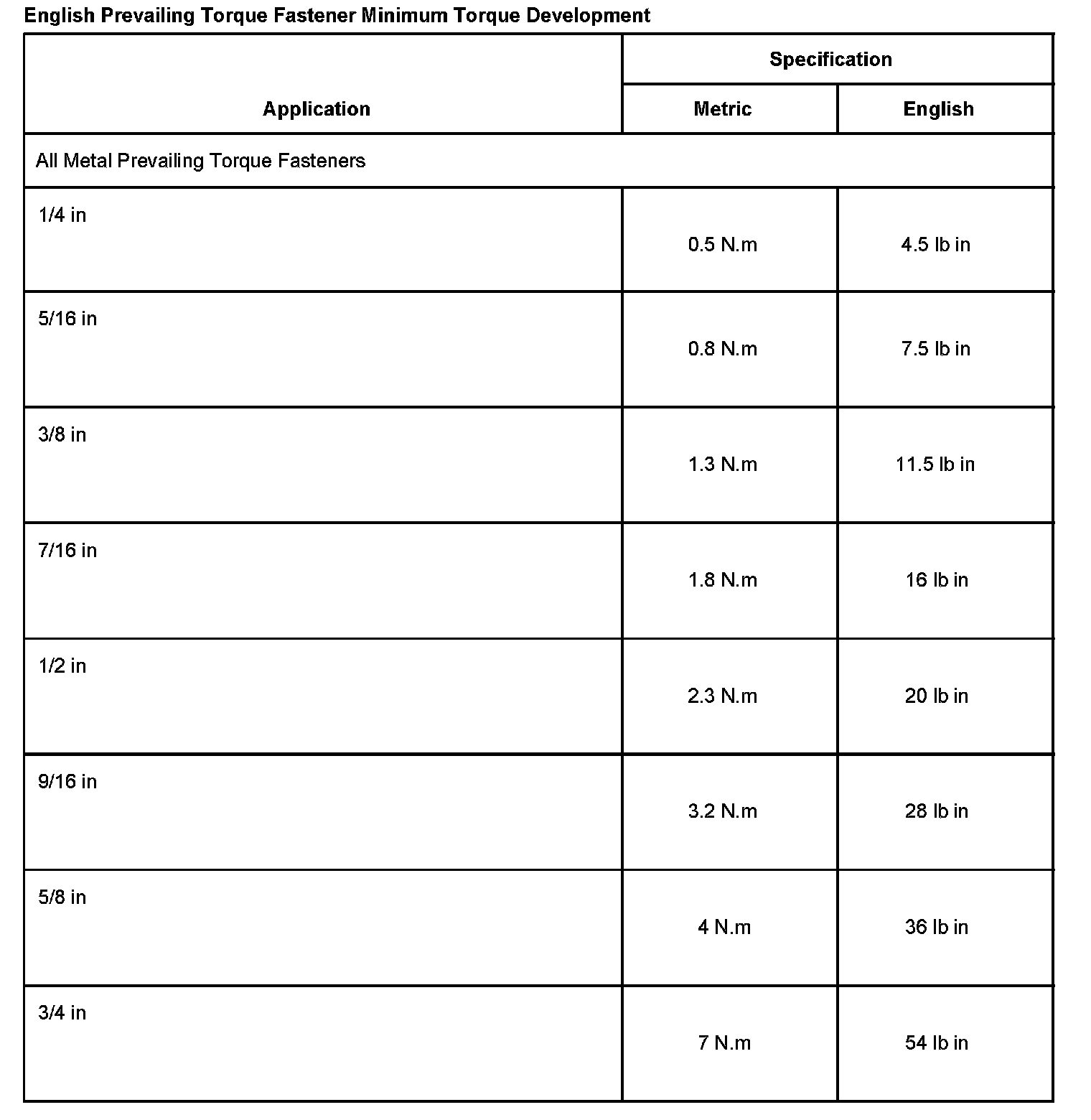 ENGLISH PREVAILING TORQUE FASTENER MINIMUM TORQUE DEVELOPMENT