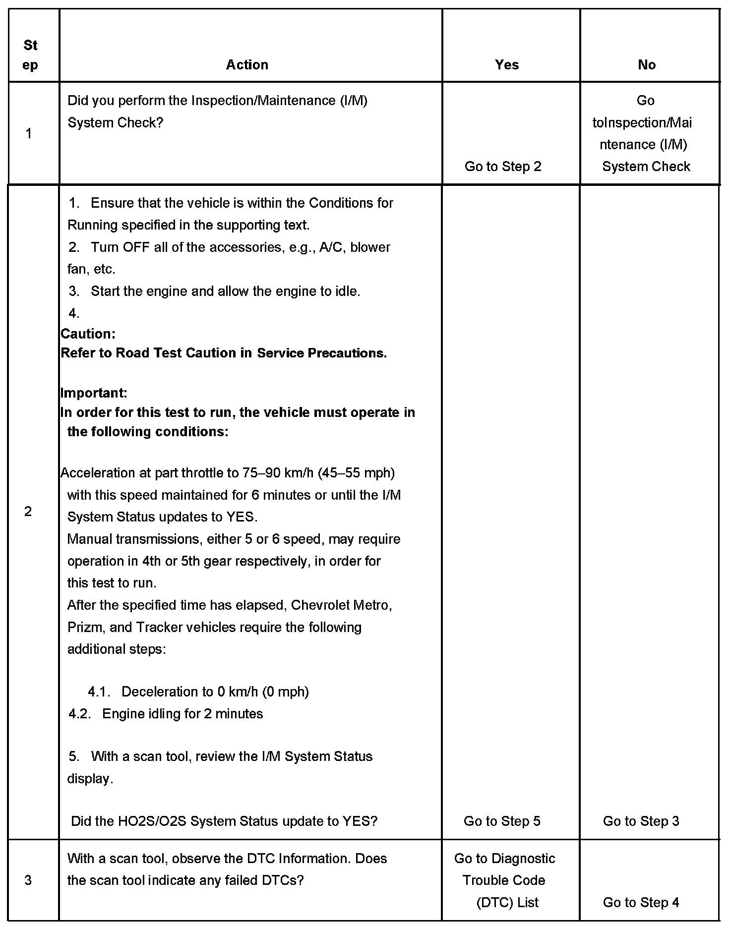 2. The oxygen sensor tests begin shortly after the indicated speed is achieved. The engine RPM may be too low in overdrive on manual transmission vehicles. If difficulty is encountered updating the status, operate the vehicle in the recommended gear during the test. Chevrolet Metro, Prizm and Tracker vehicles begin the oxygen sensor tests during the idle period immediately following the cruise period.
