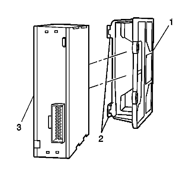 5. Release the cellular telephone module mounting bracket retaining tabs (2) and slide the cellular telephone module (3) out of the mounting bracket (1).
