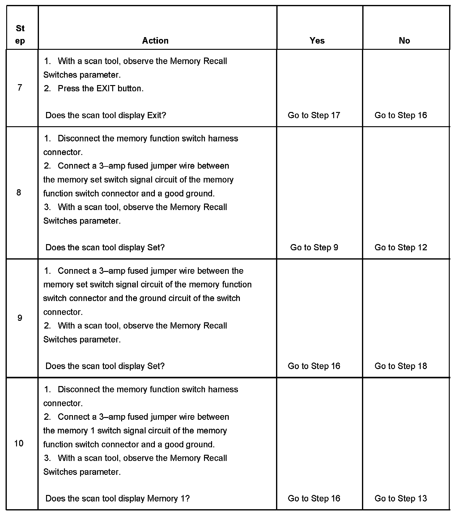 10. This step tests the integrity of the memory 1 switch signal circuit of the driver door switch assembly. If the fuse in the jumper wire opens when you perform this test, a short to battery voltage may have occurred.
