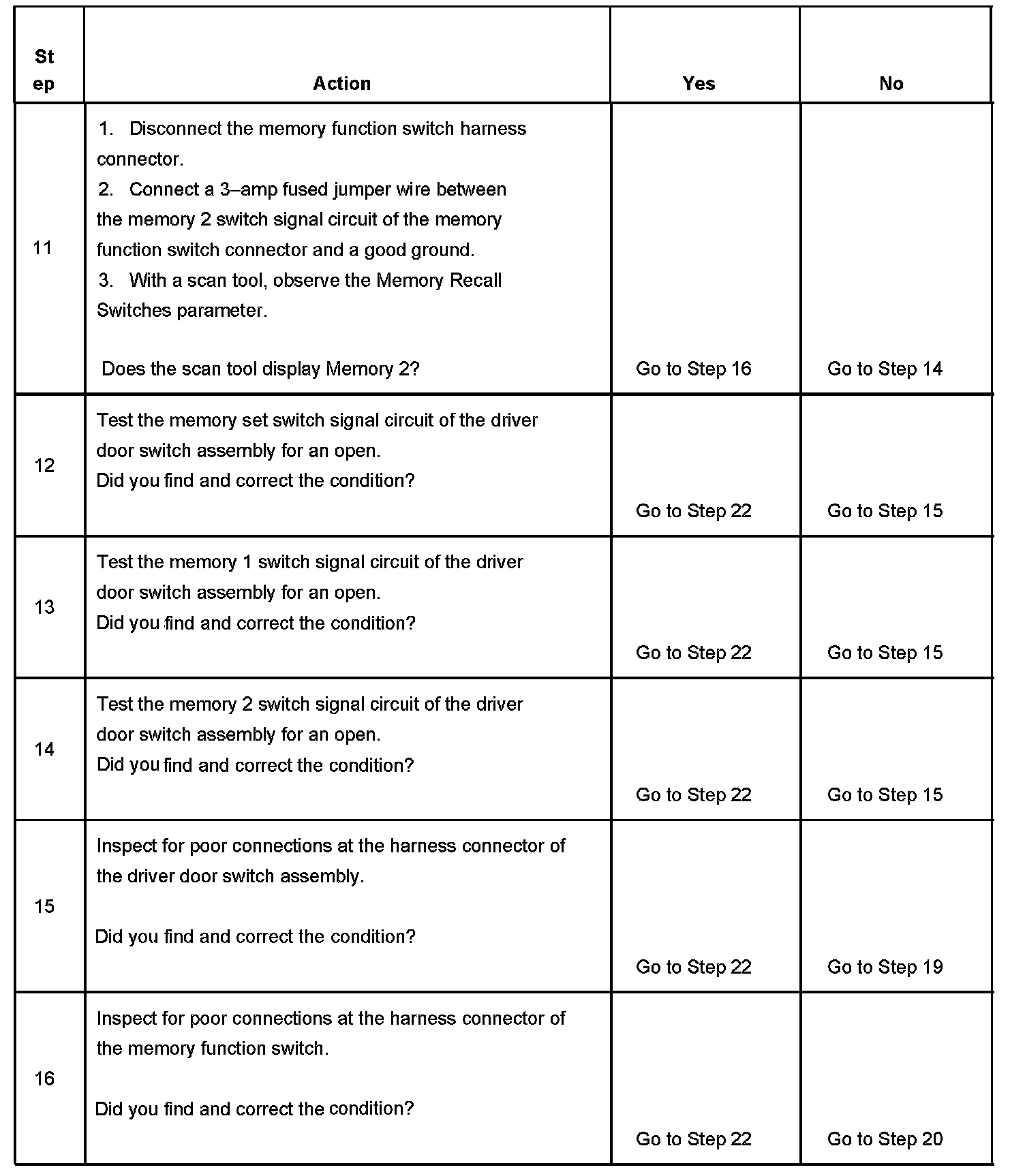 11. This step tests the integrity of the memory 2 switch signal circuit of the driver door switch assembly. If the fuse in the jumper wire opens when you perform this test, a short to battery voltage may have occurred.