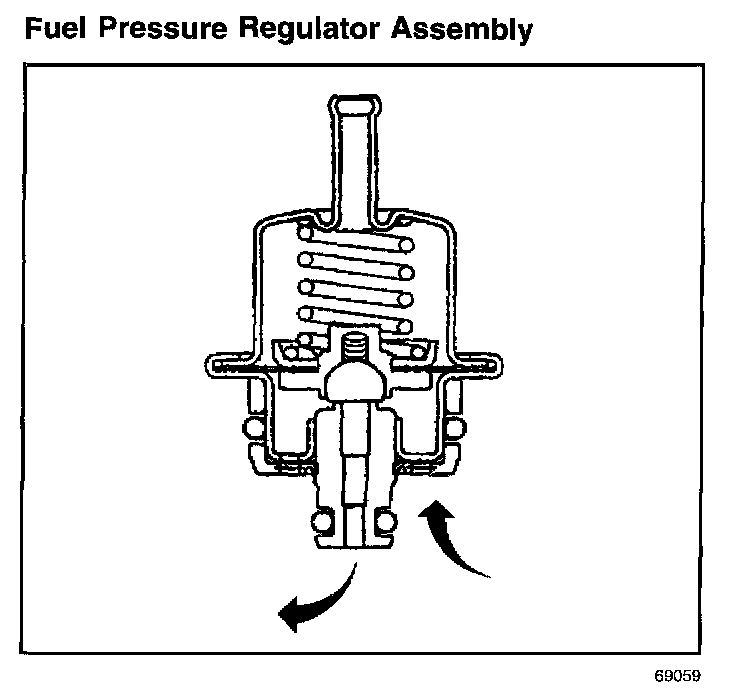 The fuel pressure regulator is a vacuum operated diaphragm relief valve with fuel pump pressure on one side and regulator spring pressure and intake manifold vacuum on the other side. The fuel pressure regulator maintains a constant pressure differential across the fuel injectors at all times. The fuel pressure regulator compensates for engine load by increasing fuel pressure as the engine vacuum drops.