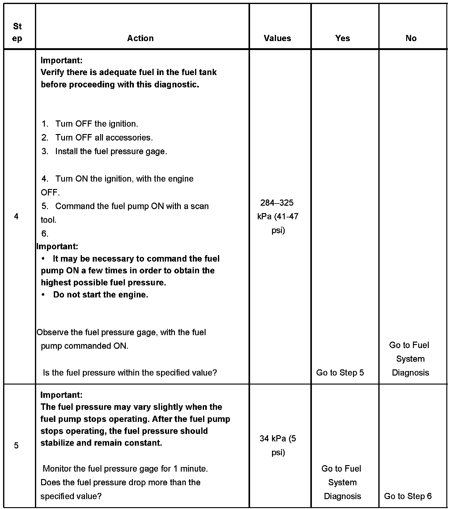5. The fuel pressure should reach a steady value. Refer to Fuel System Diagnosis if the fuel pressure does not stabilize. Component Tests and General Diagnostics
