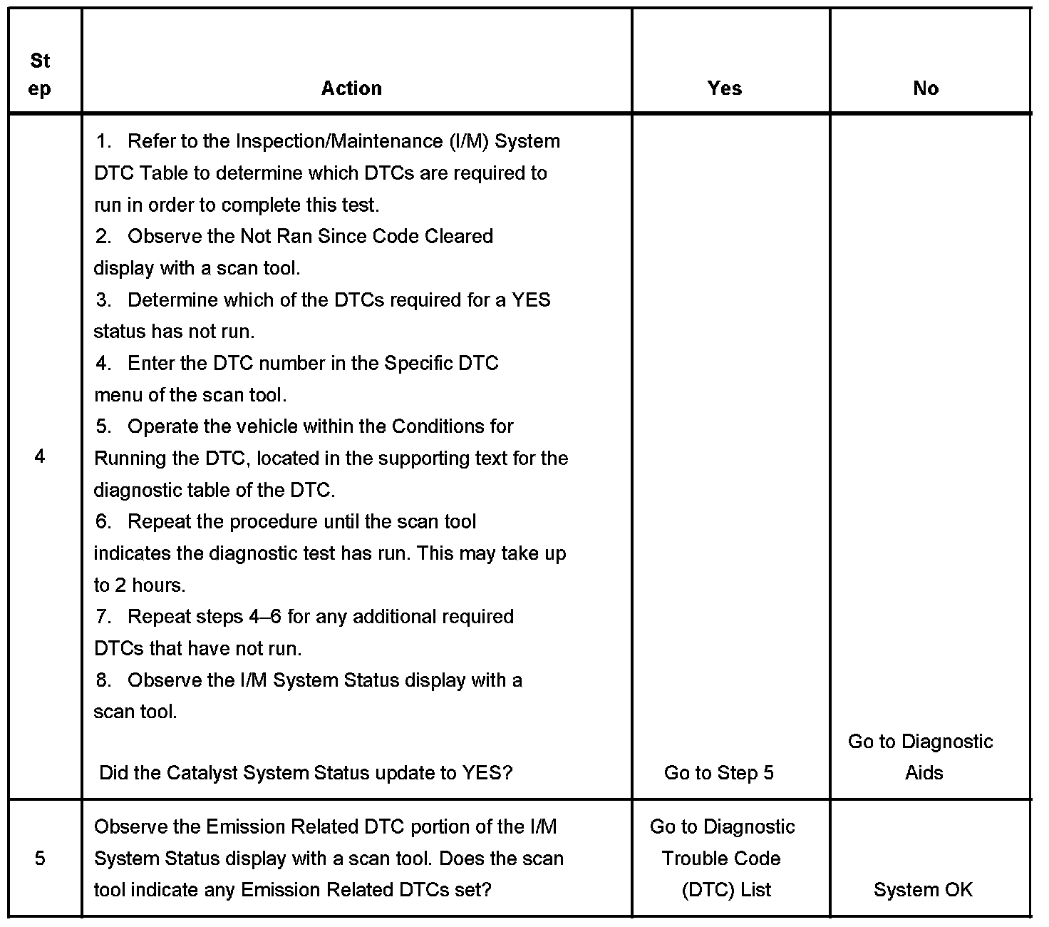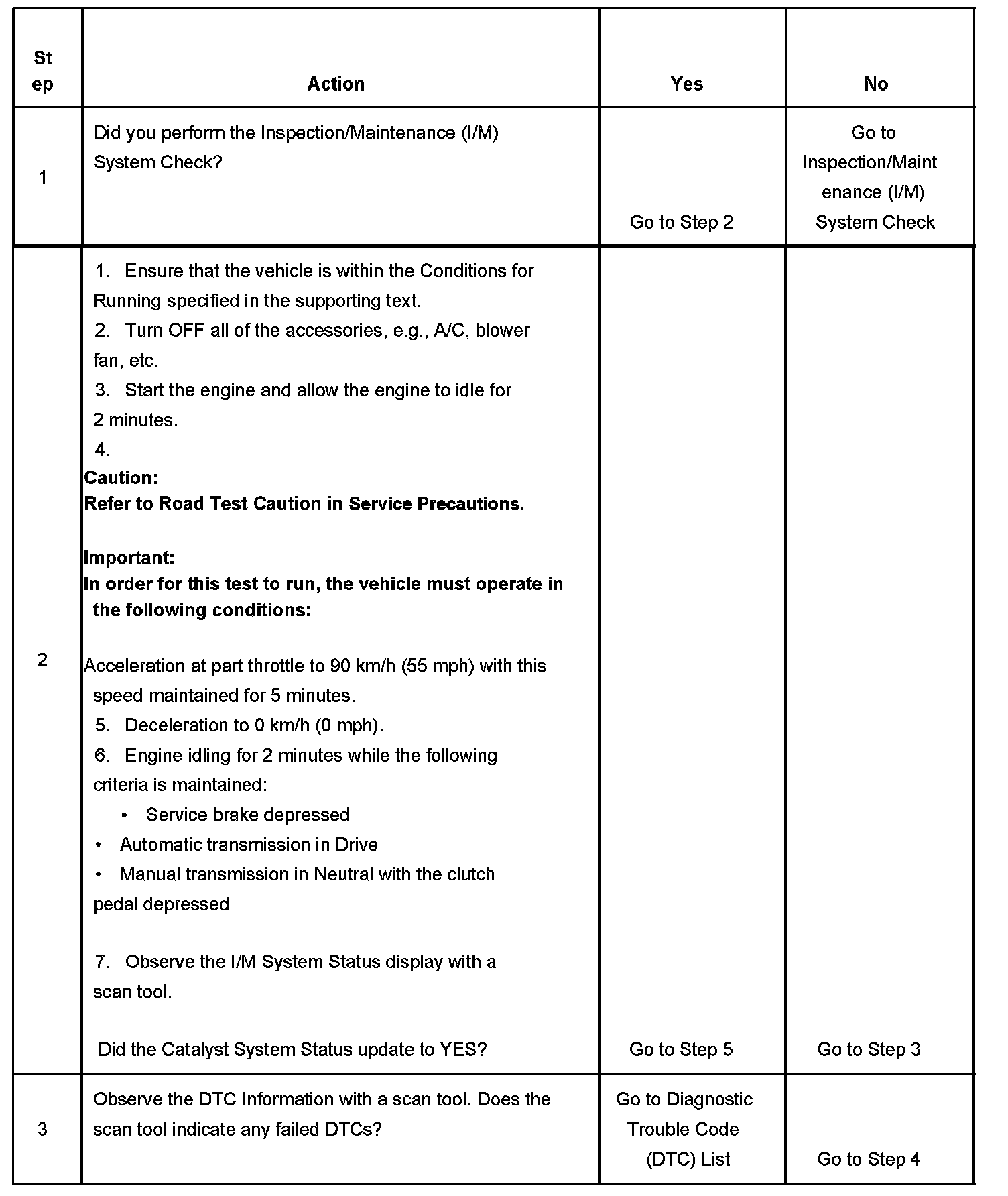 The purpose of this test is to satisfy the enable criteria necessary to execute I/M readiness diagnostics for the catalyst system. The test may be used to set the I/M System Status indicators to YES. The I/M System Status display on the scan tool provides an indication of whether the control module has completed the required tests. The I/M System Status does not indicate that the tests have passed or failed. When all of the diagnostics for a specific system have run and passed, the I/M System Status will update to YES. If a test for a specific system has failed, the I/M System Status will update to YES, indicating a determination was made, even if all of the other tests for that system have not run.