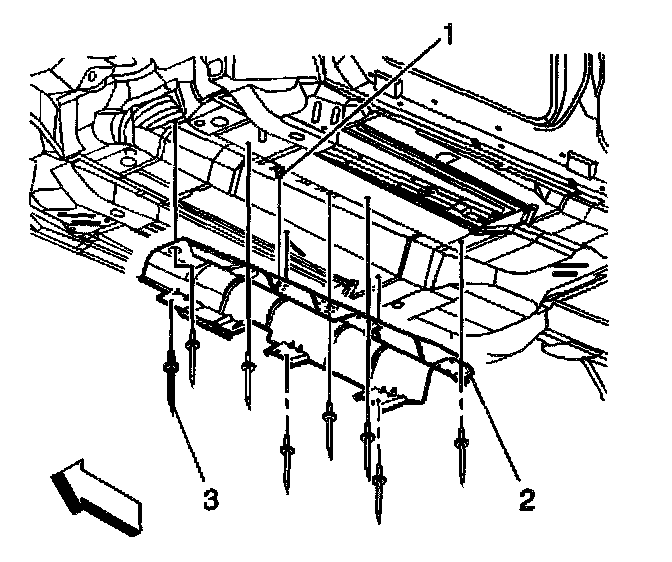 2. Using a rivet gun, fasten both the oxygen sensor wiring harness heat shield and the catalytic converter heat shield (2) to the floor panel with a single rivet (3).