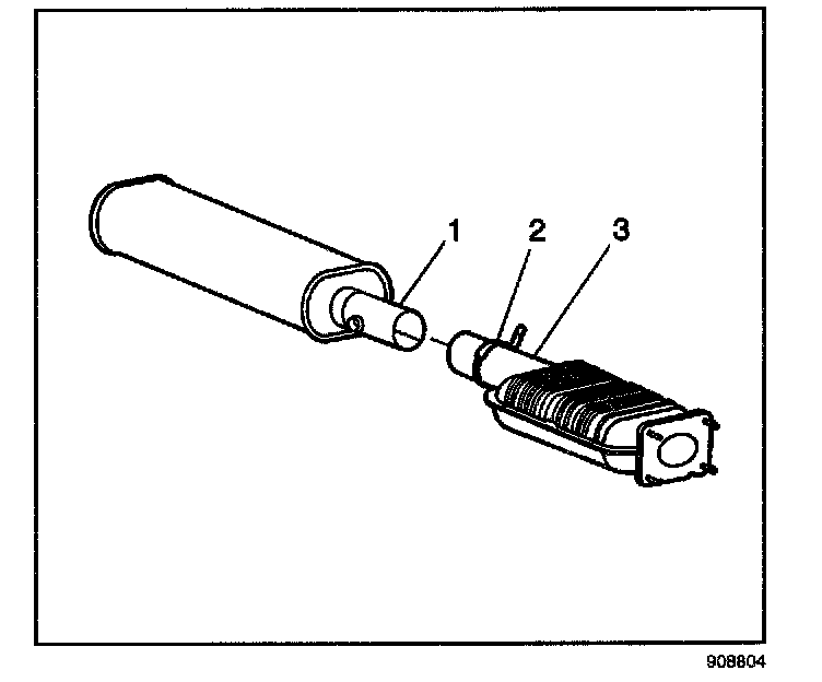 9. Cut the catalytic converter (3) from the resonator inlet pipe (1) behind the step 2 but as close to the step as the tool will permit. The replacement catalytic converter will slide over the inlet pipe.