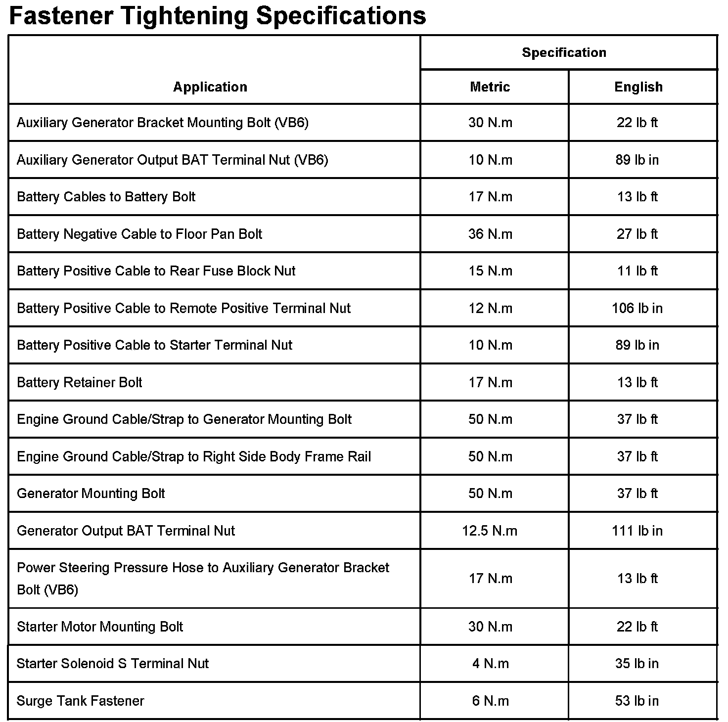 Fastener Tightening Specifications: