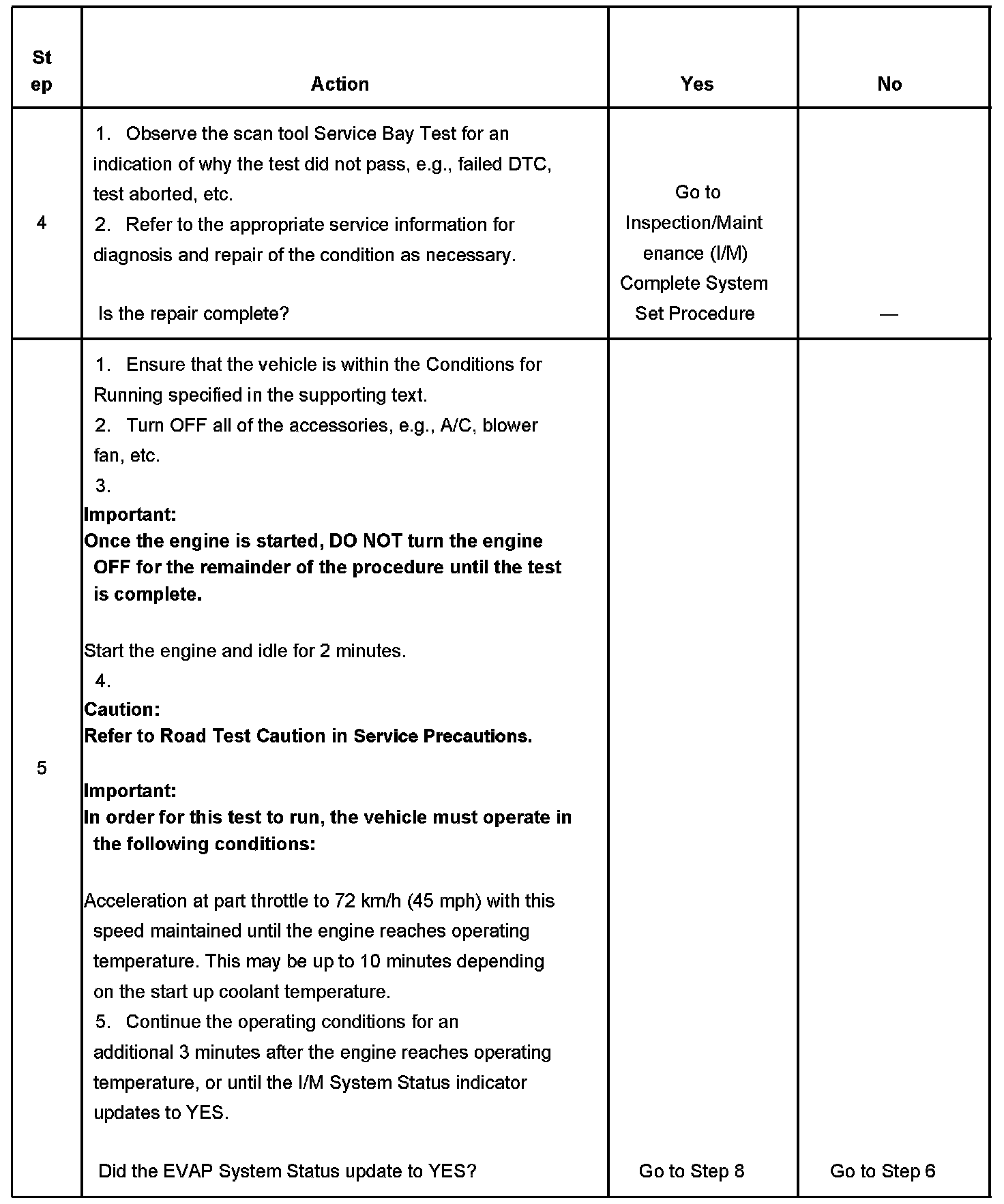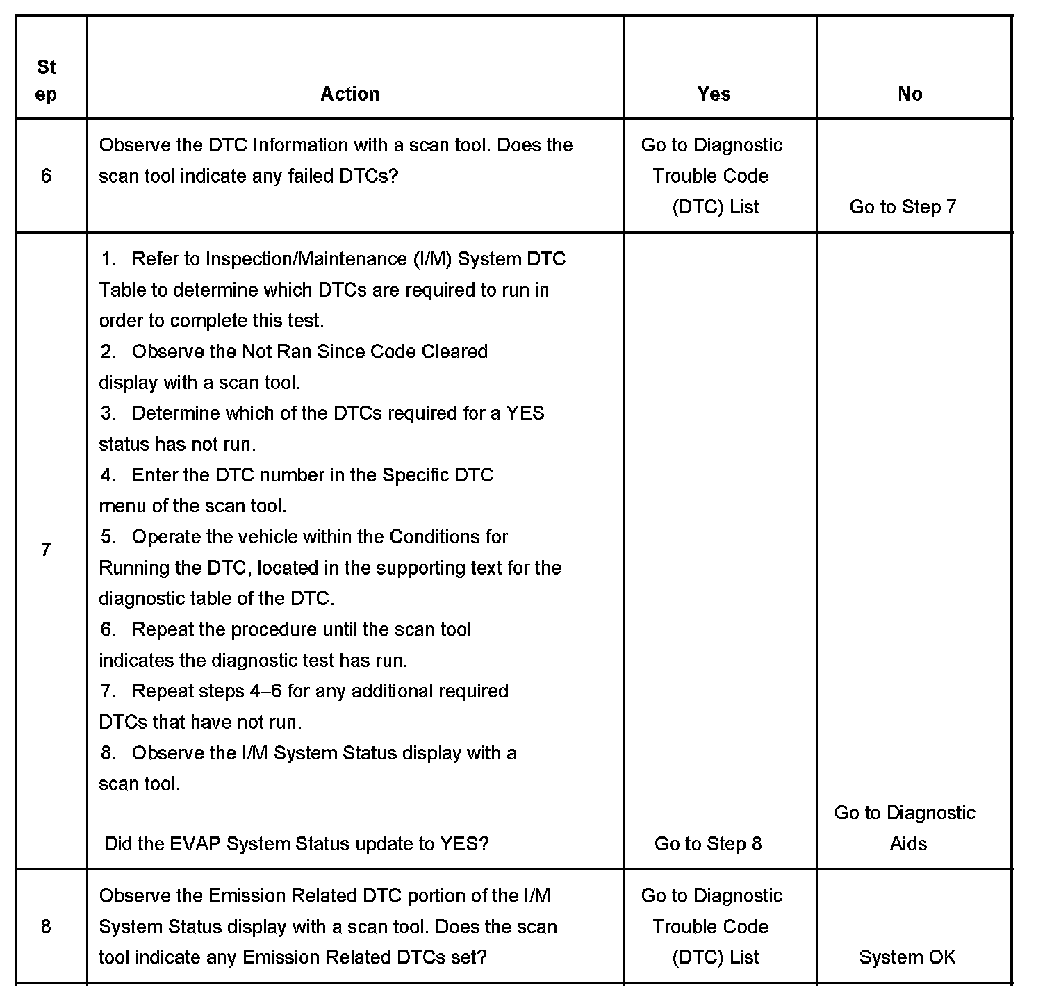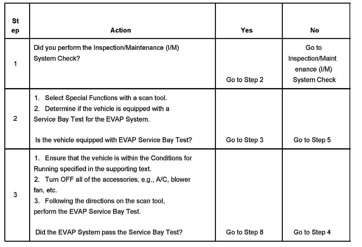 The purpose of this test is to satisfy the enable criteria necessary to execute I/M readiness diagnostics for the evaporative emission (EVAP) system. The test may be used to set the I/M System Status indicators to YES. The I/M System Status display on the scan tool provides an indication of whether the control module has completed the required tests. The I/M System Status does not indicate that the tests have passed or failed. When all of the diagnostics for a specific system have run and passed, the I/M System Status will update to YES. If a test for a specific system has failed, the I/M System Status will update to YES, indicating a determination was made, even if all of the other tests for that system have not run.