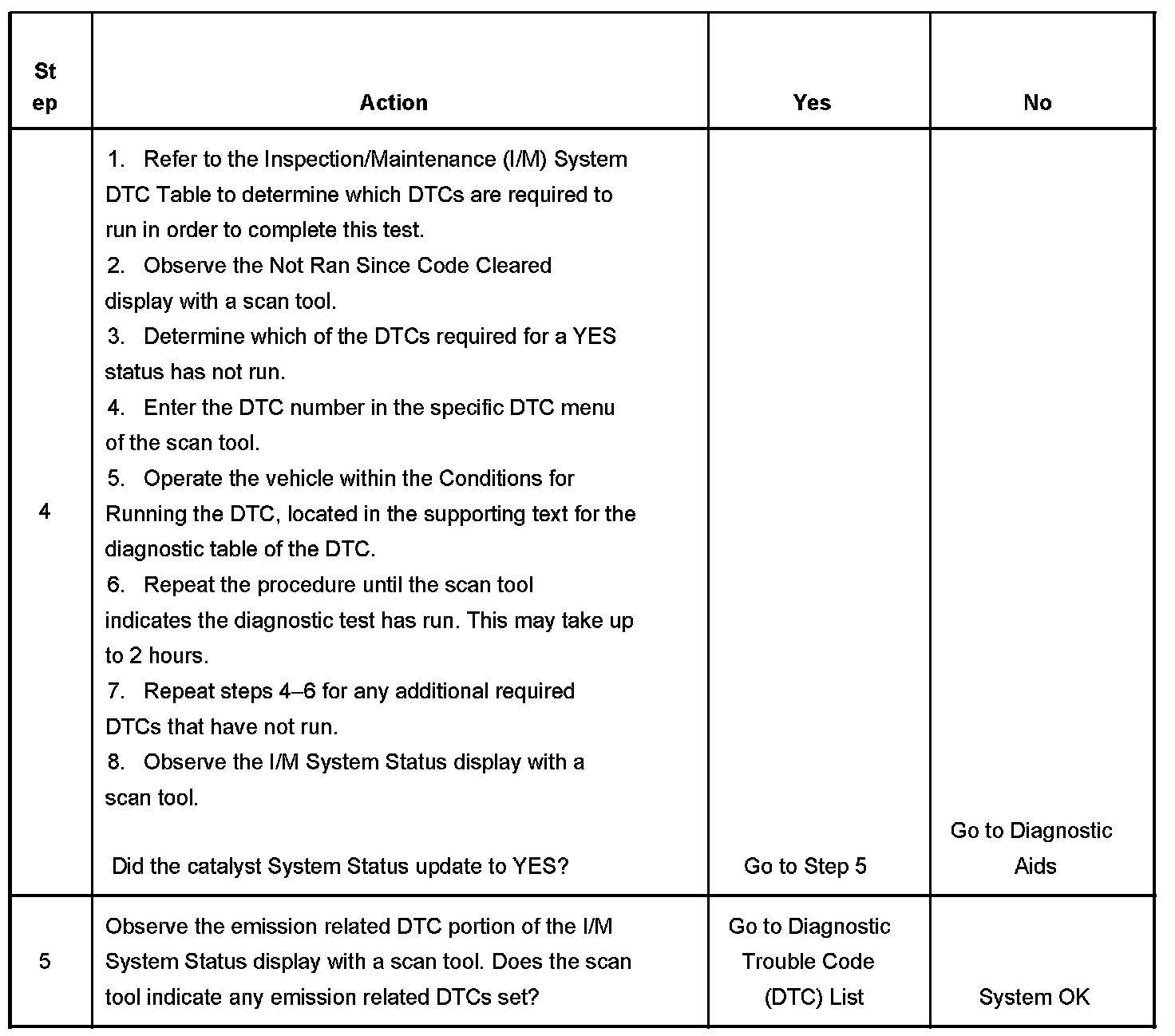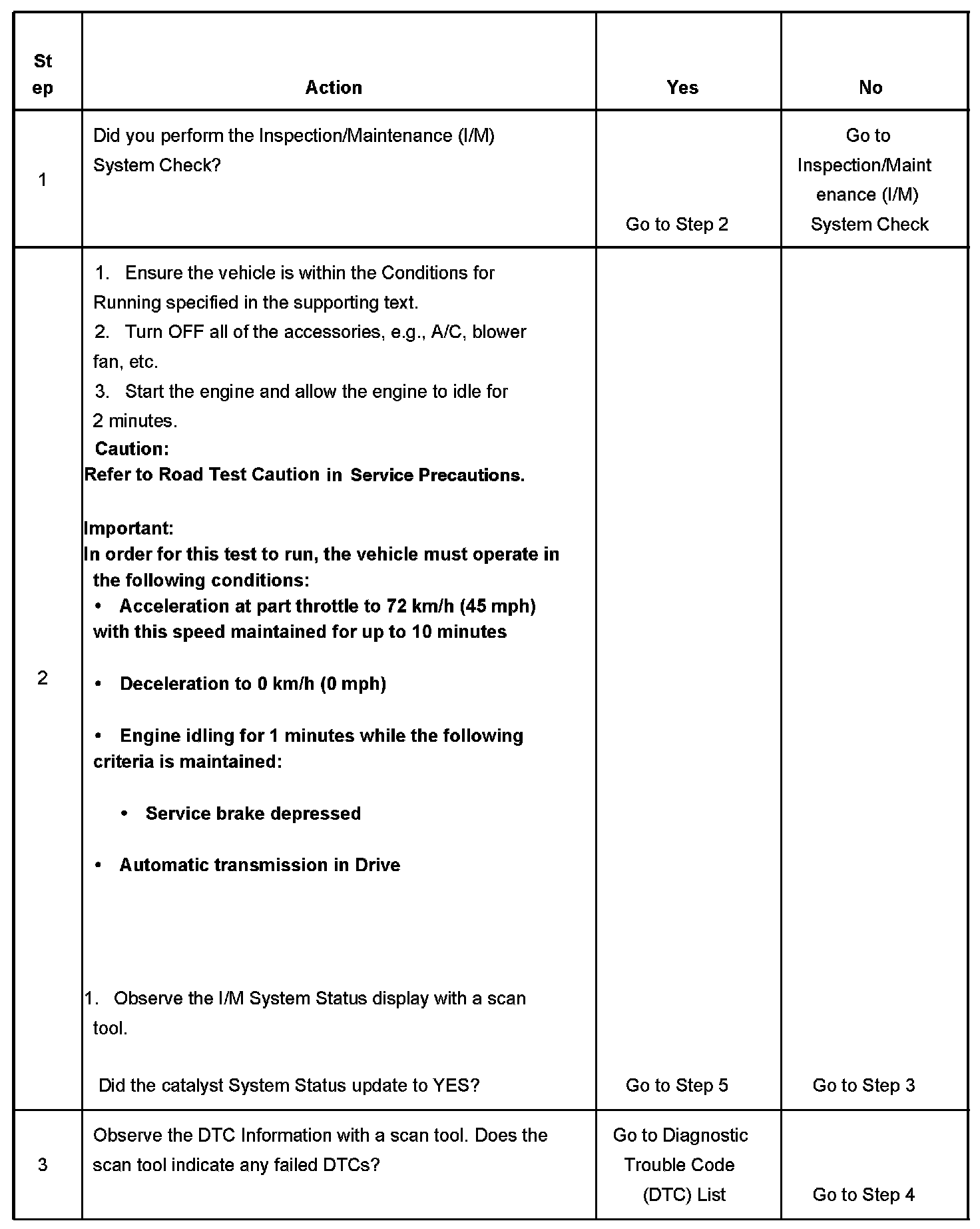 The purpose of this test is to satisfy the enable criteria necessary to execute inspection/maintenance (I/M) readiness diagnostics for the catalyst system. The test may be used to set the I/M System Status indicators to YES. The I/M System Status display on the scan tool provides an indication of whether the control module has completed the required tests. The I/M System Status does not indicate that the tests have passed or failed. When all of the diagnostics for a specific system have run and passed, the I/M System Status will update to YES. If a test for a specific system has failed, the I/M System Status will update to YES, indicating a determination was made even if all of the other tests for that system have not run.
