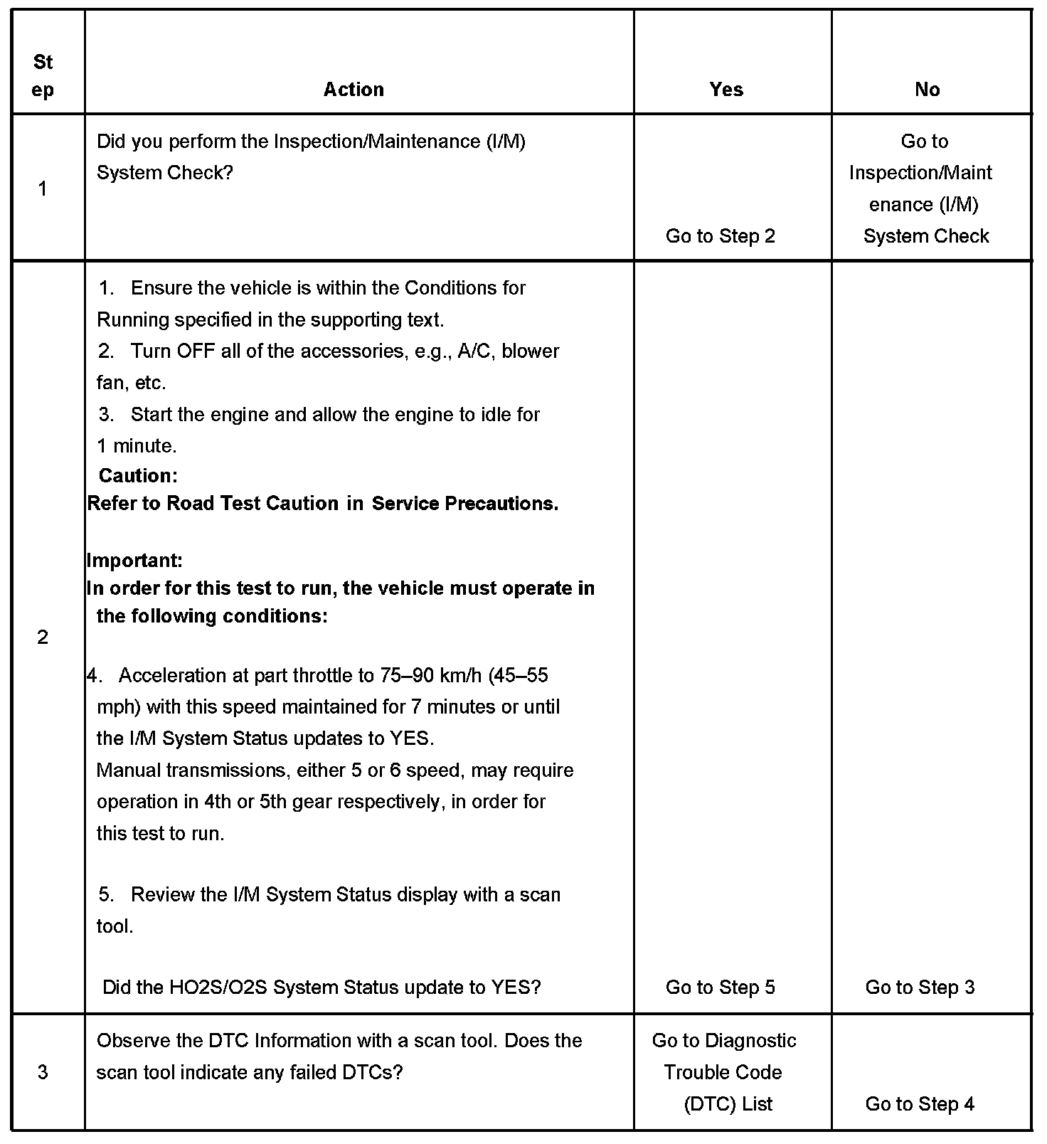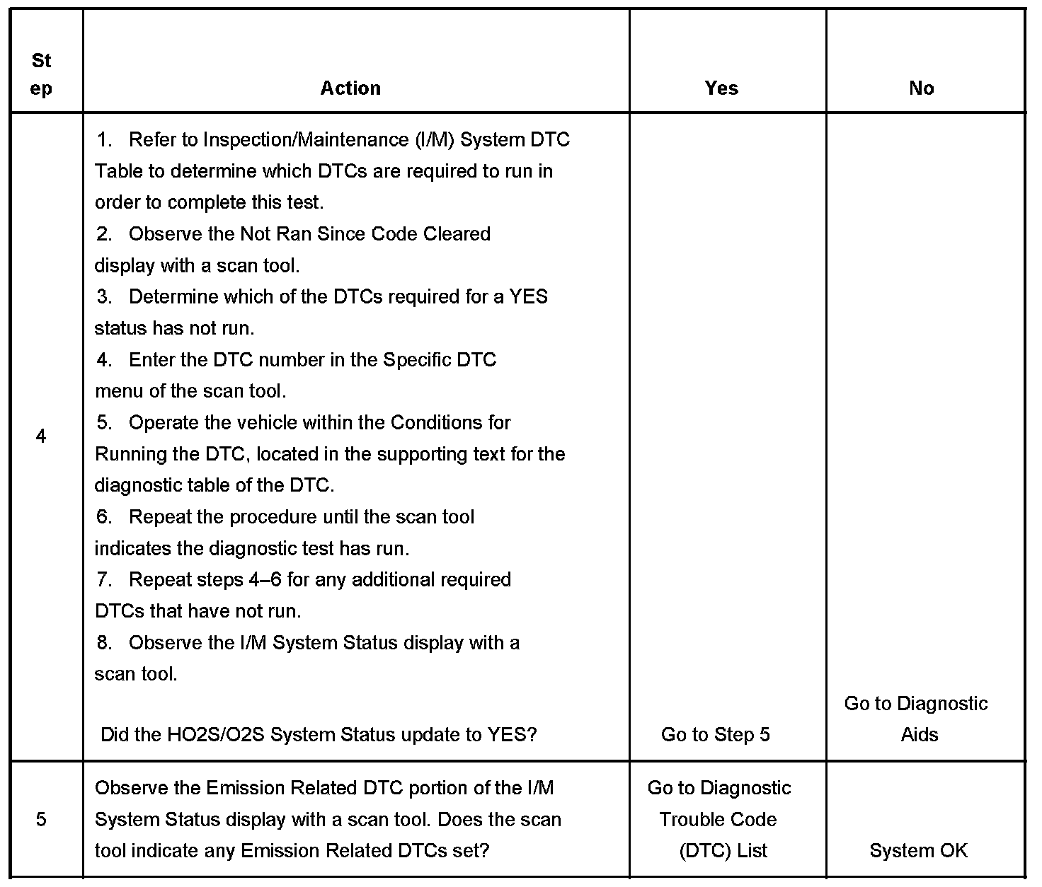 The purpose of this test is to satisfy the enable criteria necessary to execute inspection/maintenance (I/M) readiness diagnostics for the oxygen sensor (O2S, HO2S) system. The test may be used to set the I/M System Status to YES. The I/M System Status display on the scan tool provides an indication of whether the control module has completed the required tests. The I/M System Status does not indicate that the tests have passed or failed. When all of the diagnostics for a specific system have run and passed, the I/M System Status will update to YES. If a test for a specific system has failed, the I/M System Status will update to YES, indicating a determination was made, even if all of the other tests for that system have not run.