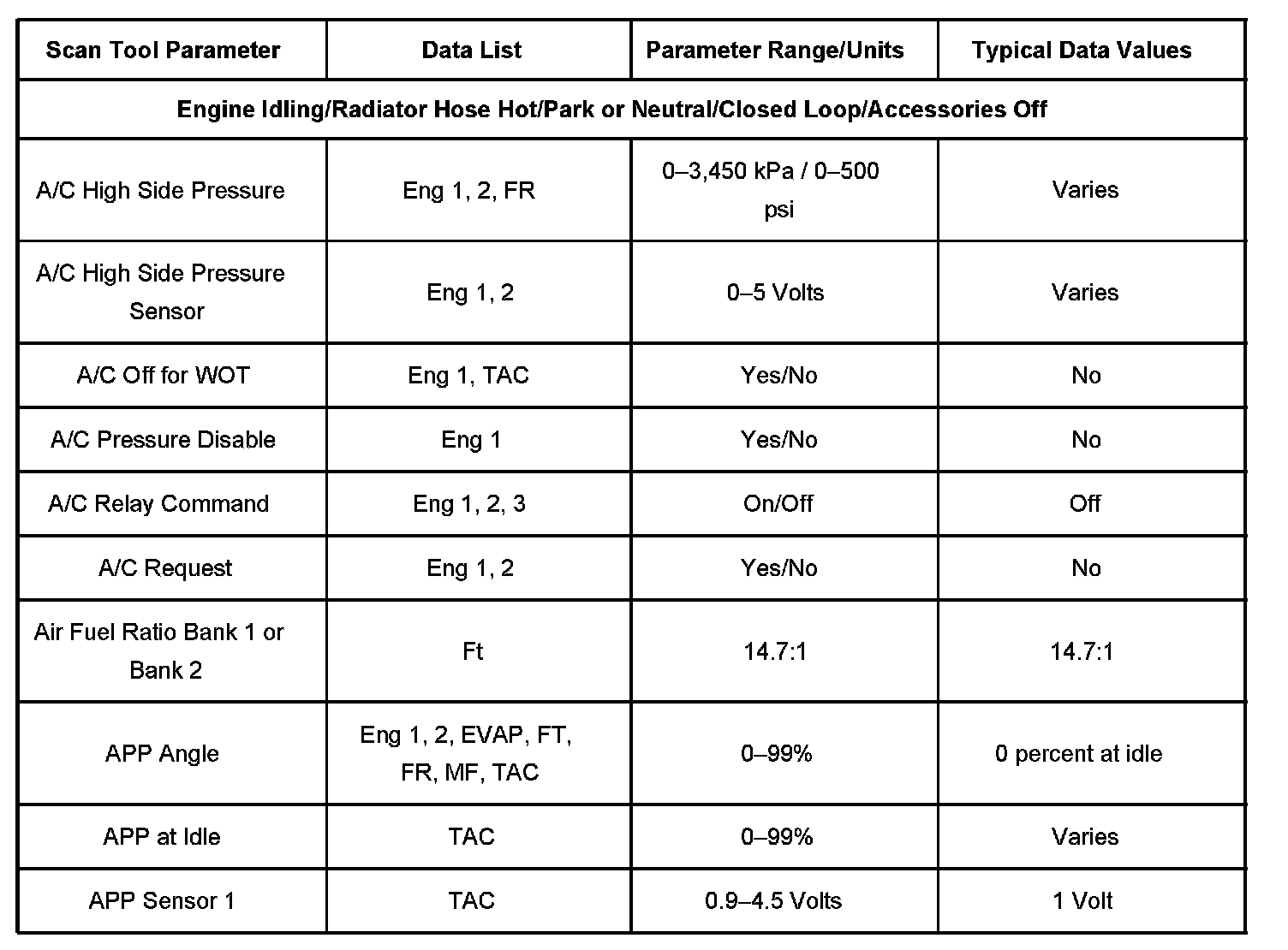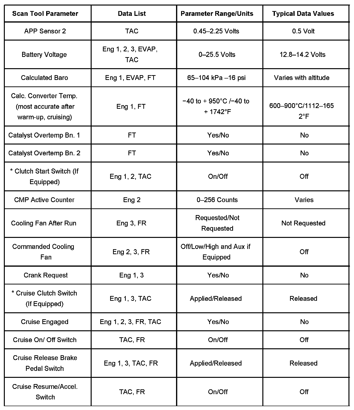 The Engine Scan Tool Data List contains all engine related parameters that are available on the scan tool. The list is arranged in alphabetical order. A parameter may appear in any one of the data lists, and in some cases may appear more than once, or in more than one data list in order to group certain related parameters together.