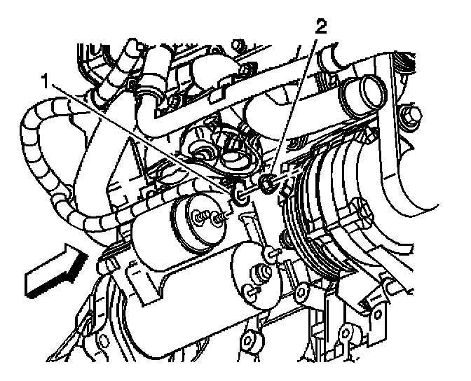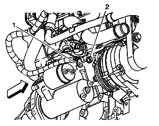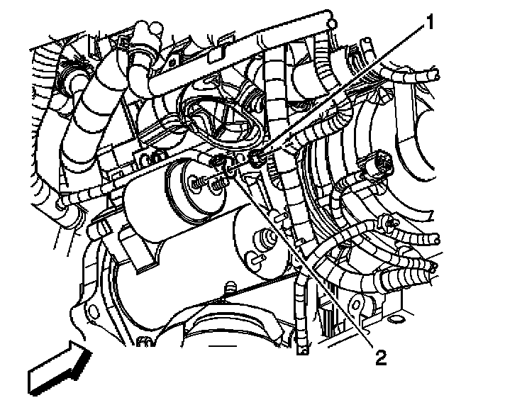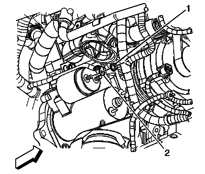 4. Connect the lead (2) to the starter solenoid and install the starter solenoid "S" terminal nut (1).