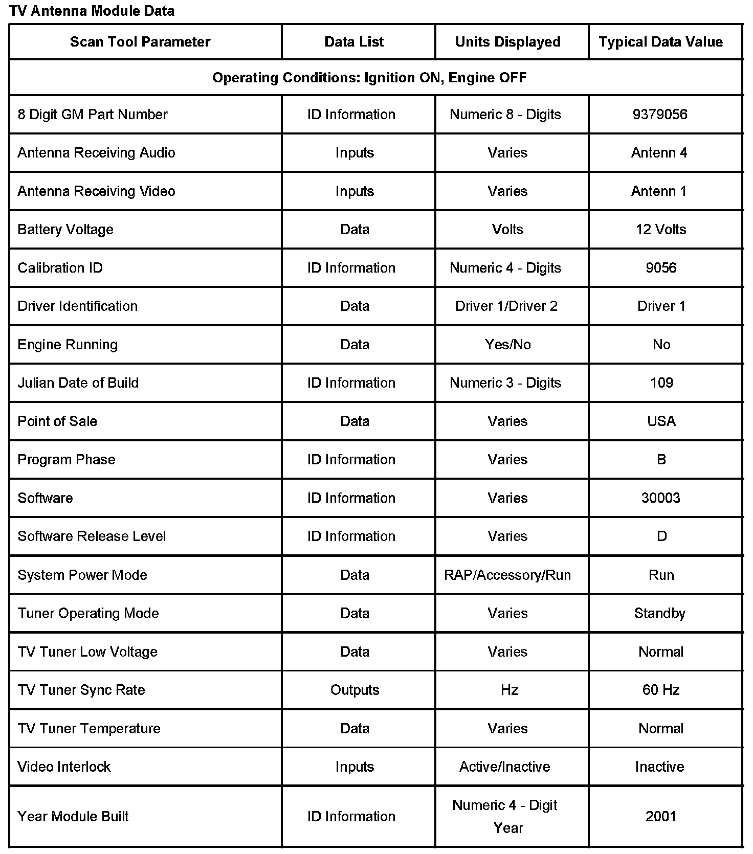 Scan Tool Data List-TV Antenna Module Data: