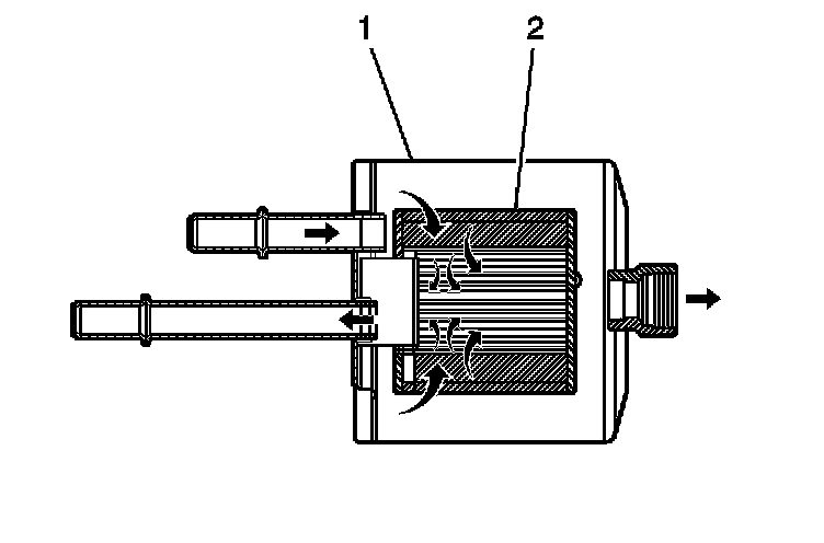 The fuel filter is located on the fuel feed pipe, between the fuel pump and the fuel rail. The electric fuel pump supplies fuel through the in-line fuel filter to the fuel injection system. The fuel pressure regulator keeps the fuel available to the fuel injectors at a regulated pressure. Unused fuel is returned from the fuel filter to the fuel tank by a separate fuel return pipe. The paper filter element (2) traps particles in the fuel that may damage the fuel injection system. The filter housing (1) is made to withstand maximum fuel system pressure, exposure to fuel additives, and changes in temperature. There is no service interval for fuel filter replacement. Replace a restricted fuel filter.