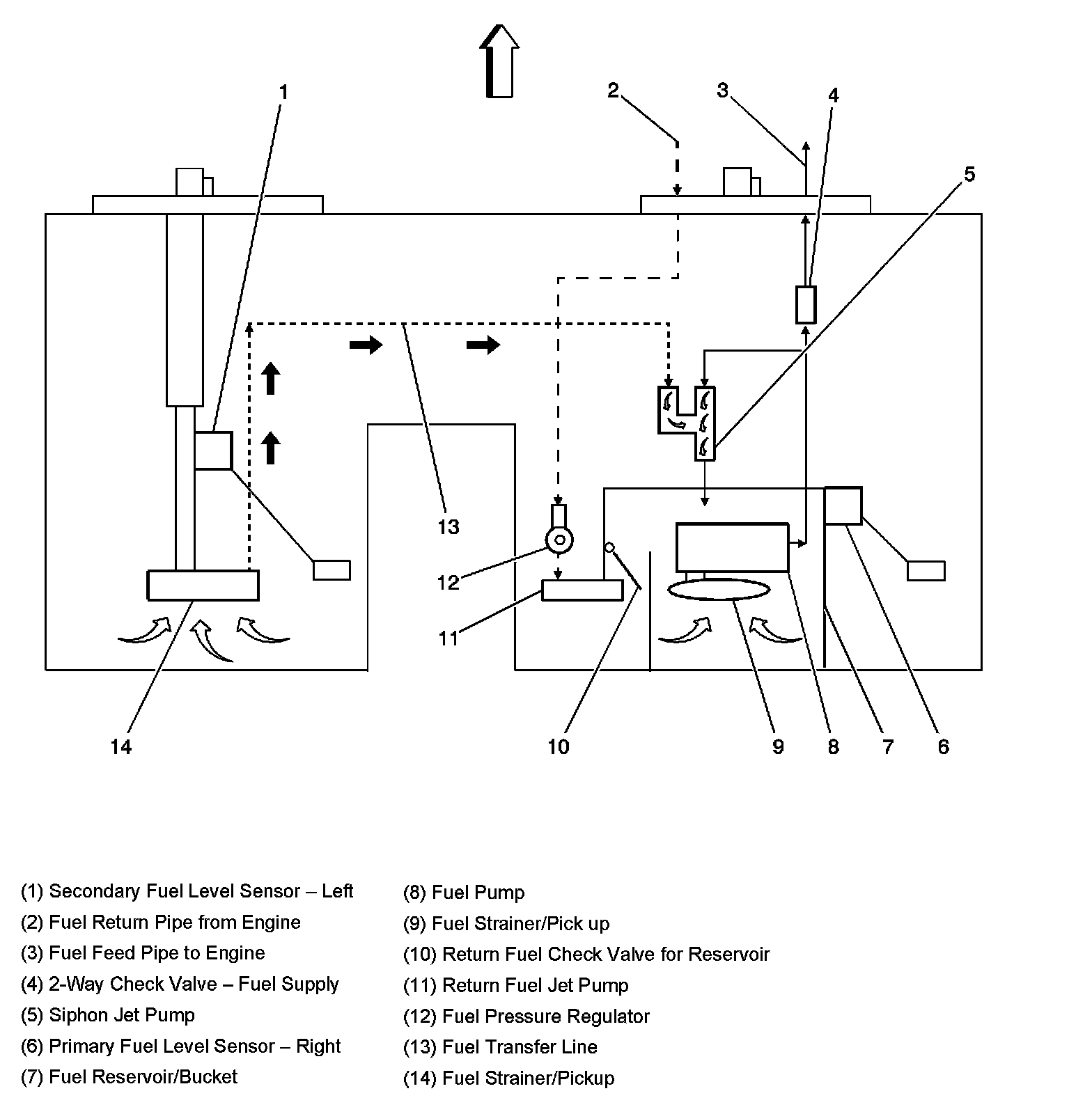 The modular fuel sender assembly maintains an optimum fuel level in the reservoir (bucket). The fuel entering the reservoir is drawn in by the following components: