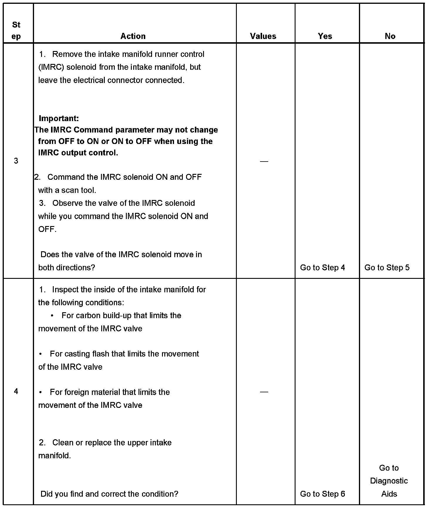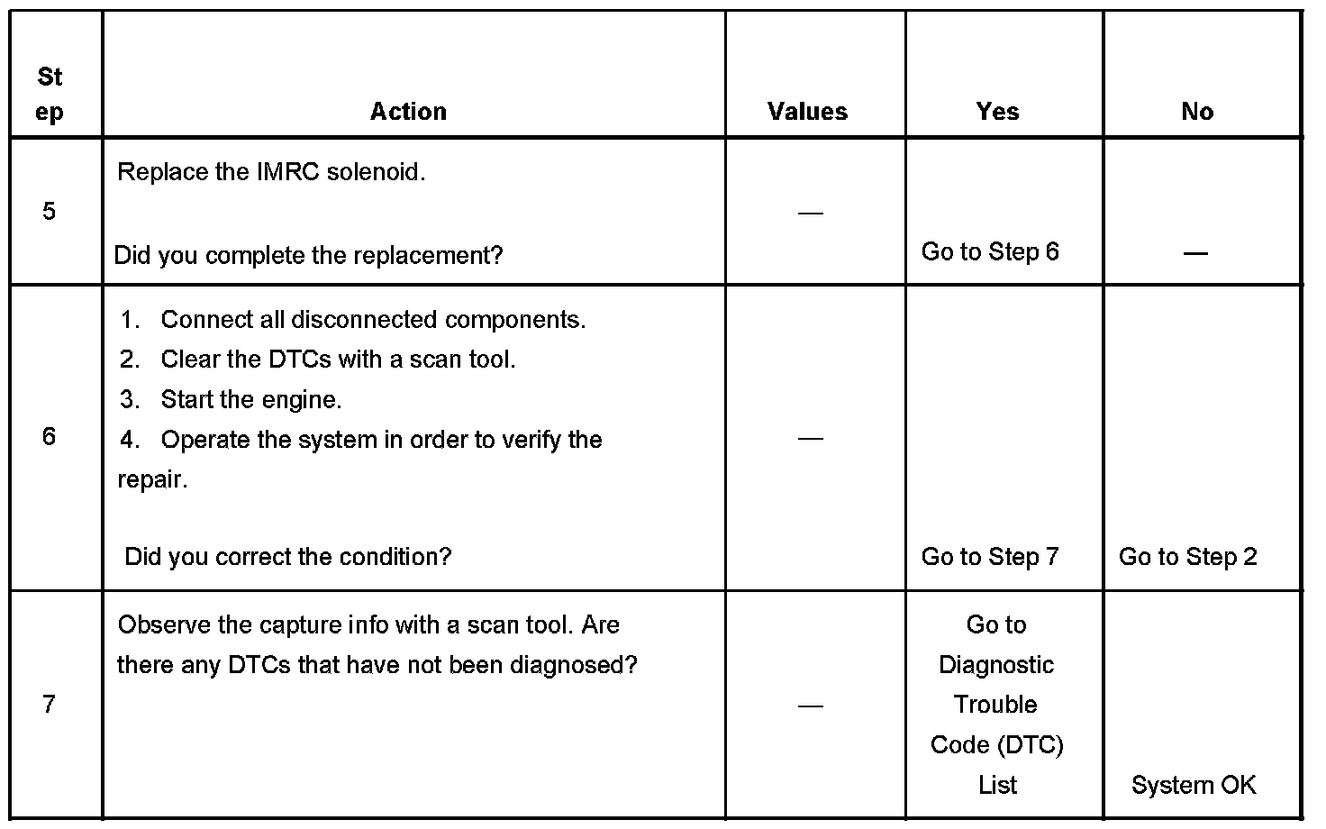 2. This diagnostic table will only diagnose the mechanical portion of the IMRC solenoid. If there is a DTC set for the IMRC solenoid, refer to the appropriate DTC table.