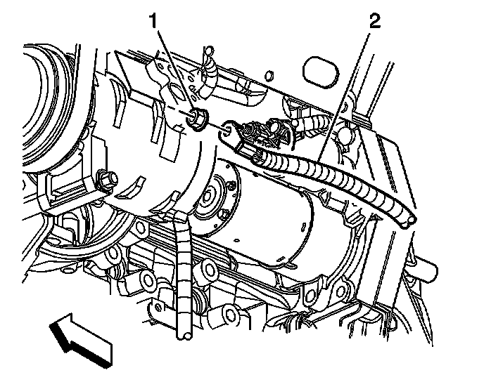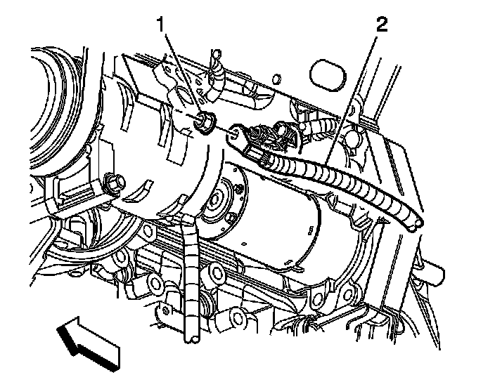4. Remove the starter terminal nut (1) and the battery positive cable (2) from the starter.
