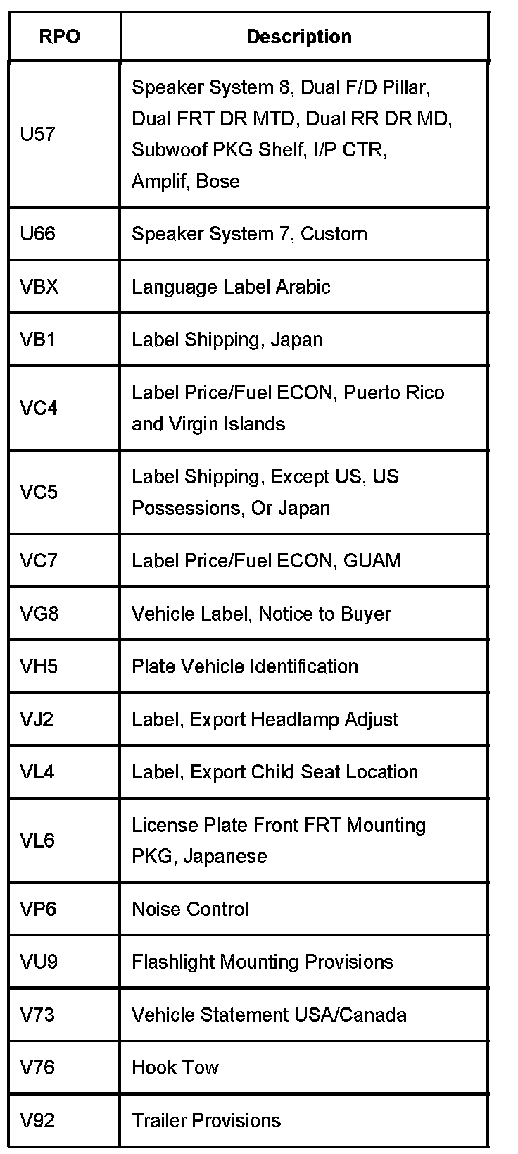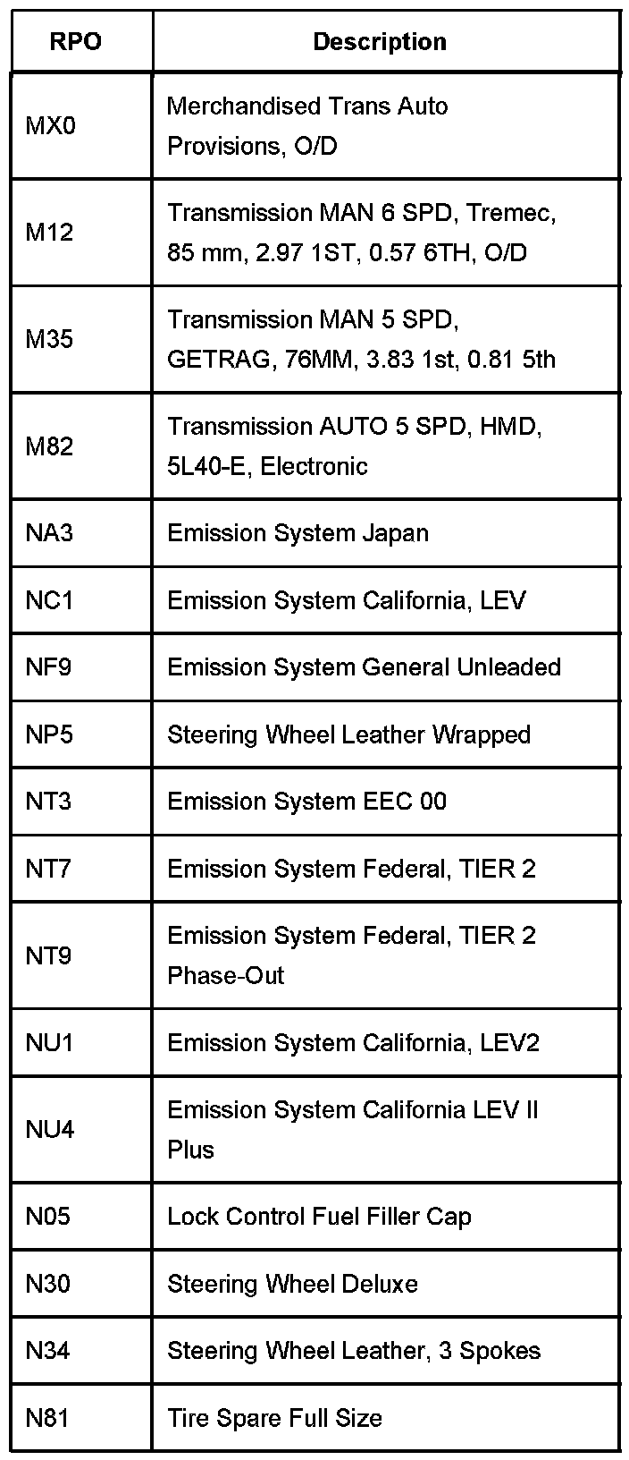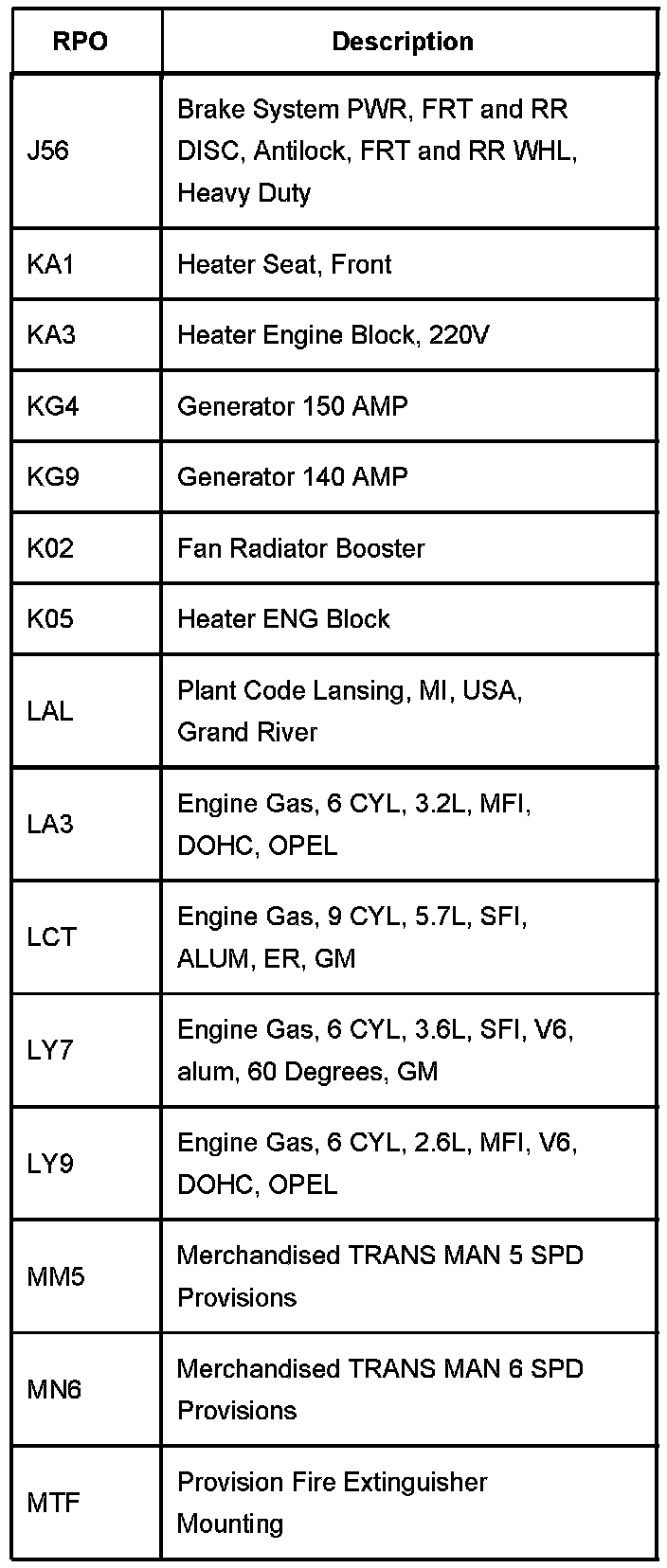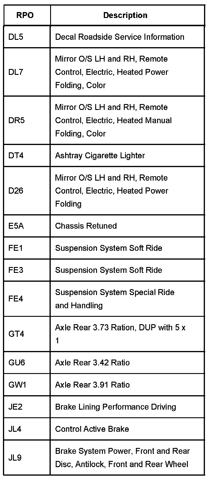 This provides the description of the Regular Production Option (RPO) codes that are available on the vehicle. The vehicle's RPO list is printed on the Service Parts Identification Label.