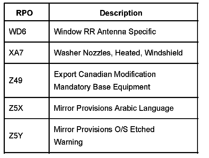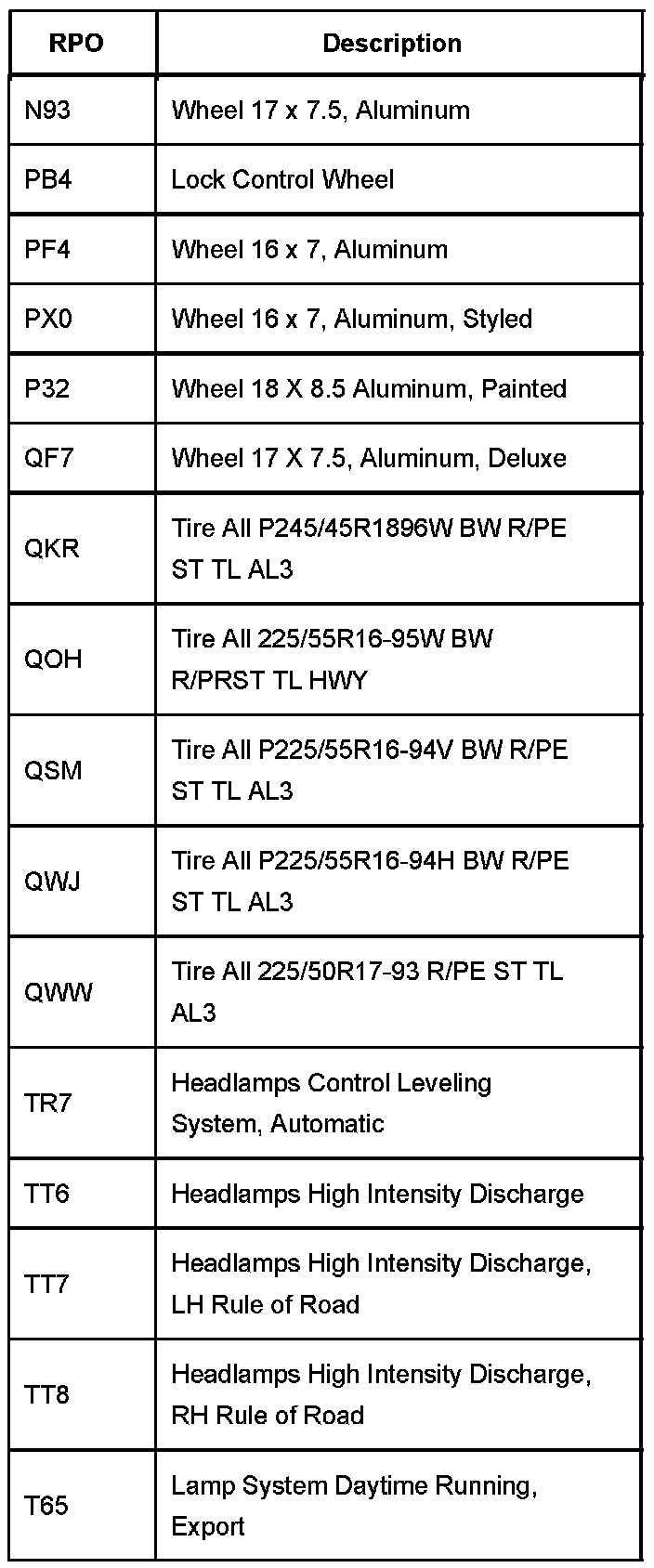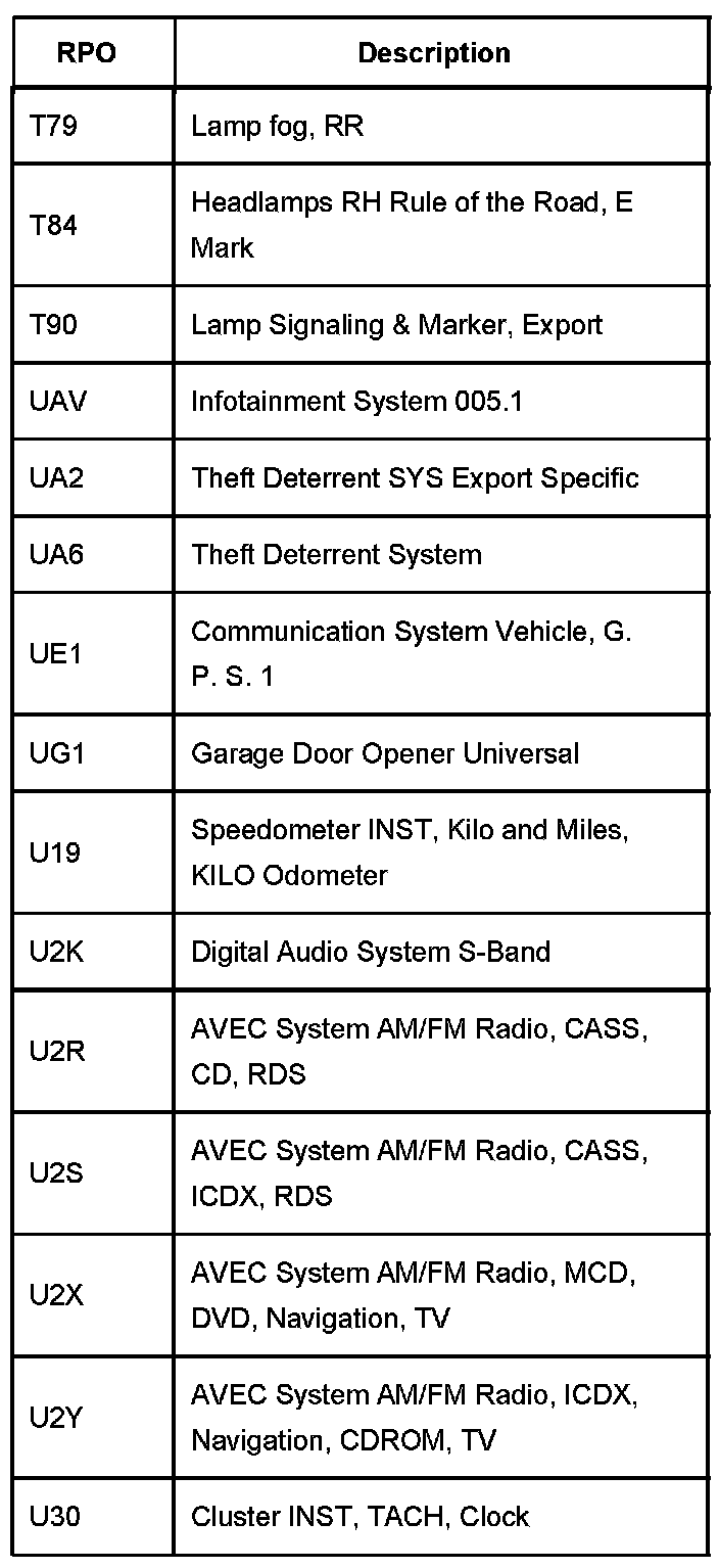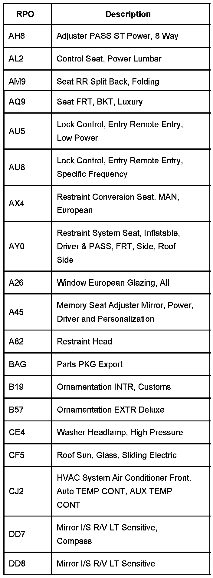 This provides the description of the Regular Production Option (RPO) codes that are available on the vehicle. The vehicle's RPO list is printed on the Service Parts Identification Label.