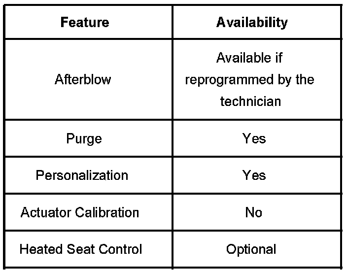 HVAC CONTROL MODULEThe HVAC control module is a class 2 device that interfaces between the operator and the HVAC system to maintain air temperature and distribution settings. The battery positive voltage circuit provides power that the control module uses for keep alive memory (KAM). The dash integration module (DIM),which is the vehicle power mode master, provides a device on signal. The control module supports the features in the table.