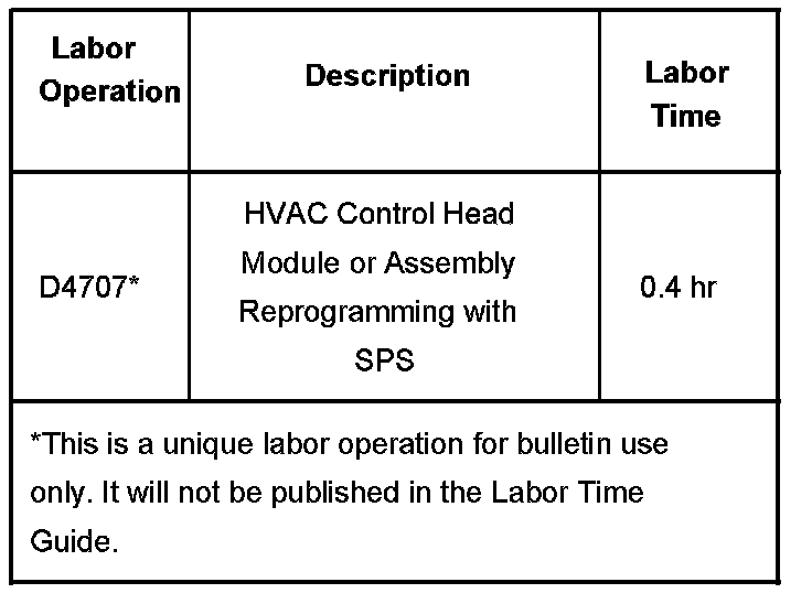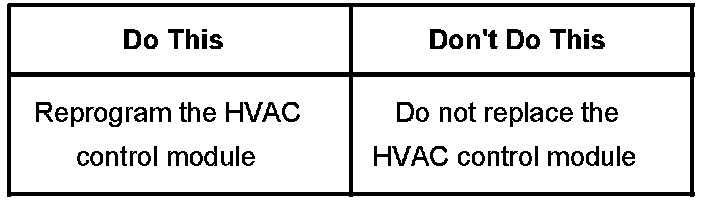 A revised calibration has been developed to address this condition. Technicians are to reprogram the HVAC Control Module using the Service Programming System (SPS) with the latest software available on TIS2WEB. Refer to the HVAC Control Module Programming and Setup procedures in SI. As always make sure your Tech 2(R) is updated with the latest software version.
