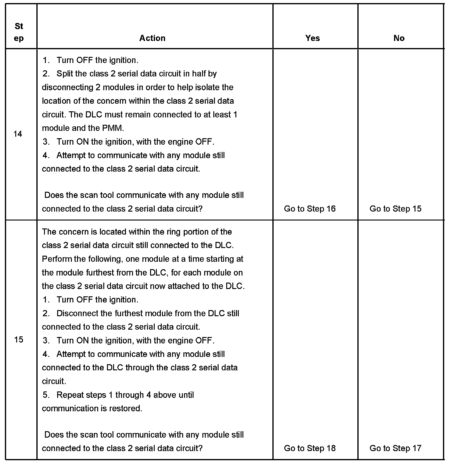 14. Splitting the class 2 serial data circuit will help isolate the location of the malfunction. If communication can be established, the concern is located in the wiring or one of the modules that is no longer connected to the DLC. If communication cannot be established, the concern is located in the wiring or one of the modules that is still connected to the DLC.
