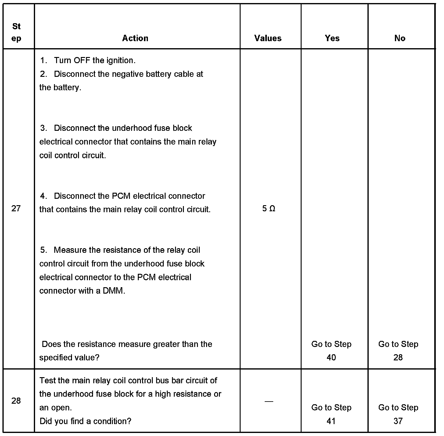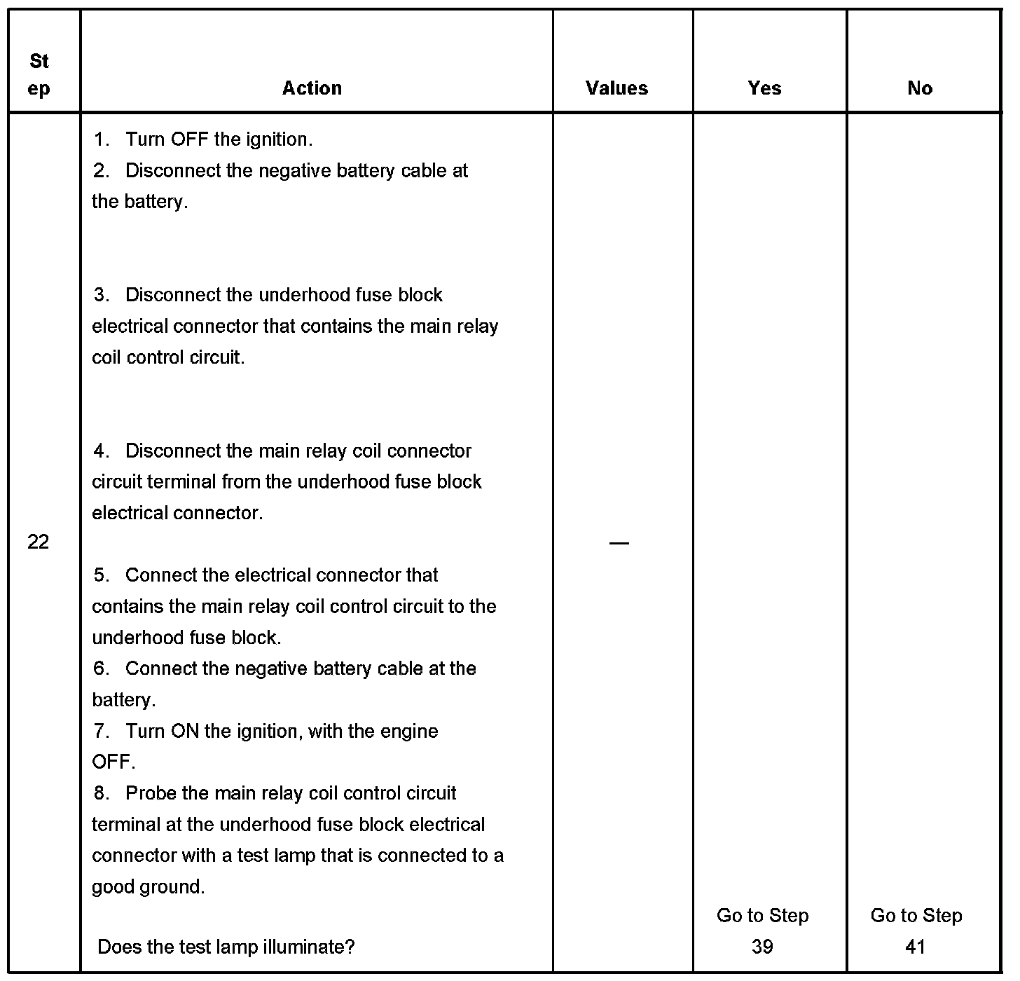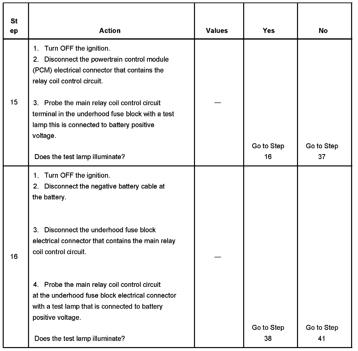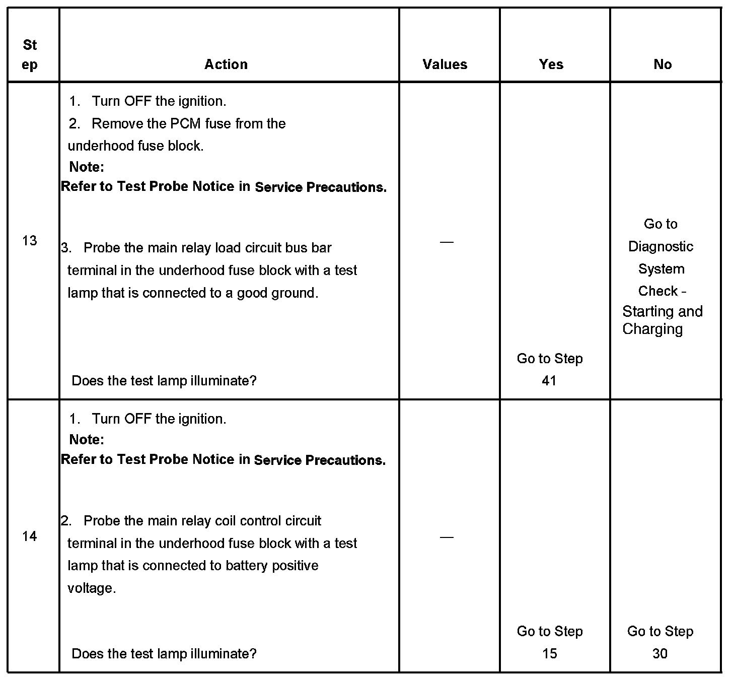 If the main relay fails to close the engine will crank, but will not run. The PCM class 2 communications will be available with the use of a scan tool. The main relay system diagnosis table assumes that the vehicle battery if fully charged. Refer to Battery Inspection/Test in Starting and Charging. Battery Inspection/Test